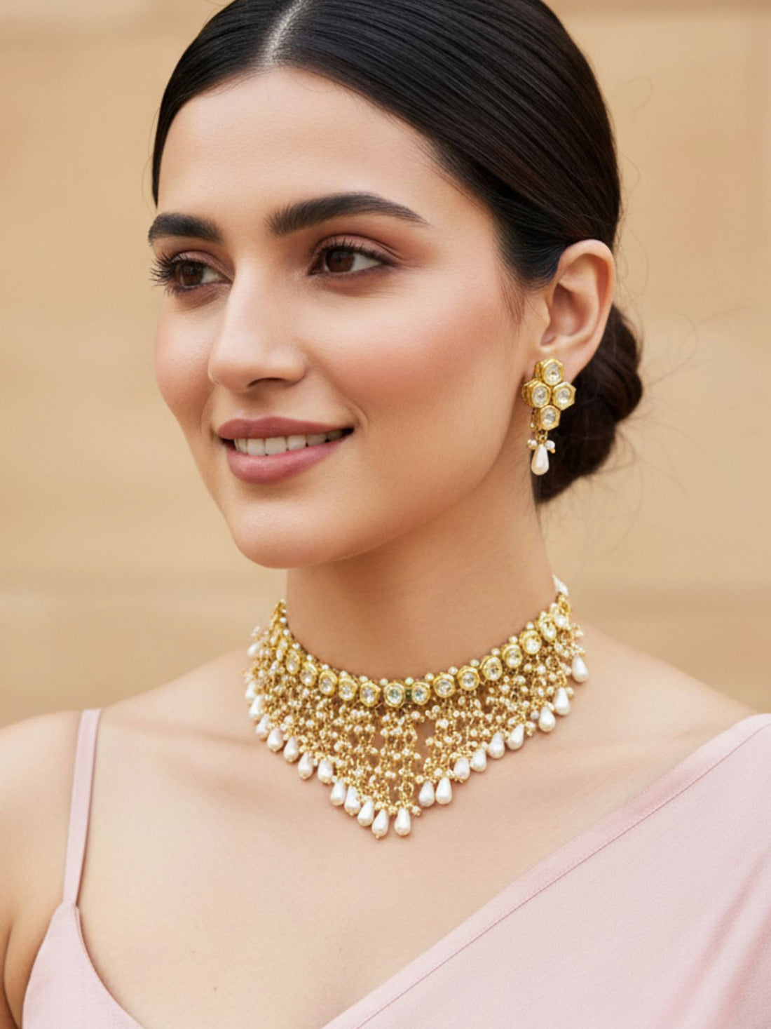 KARATCART Traditional Gold-Plated Polki Kundan Drop Pearl Beaded Choker Jewellery Set for Women