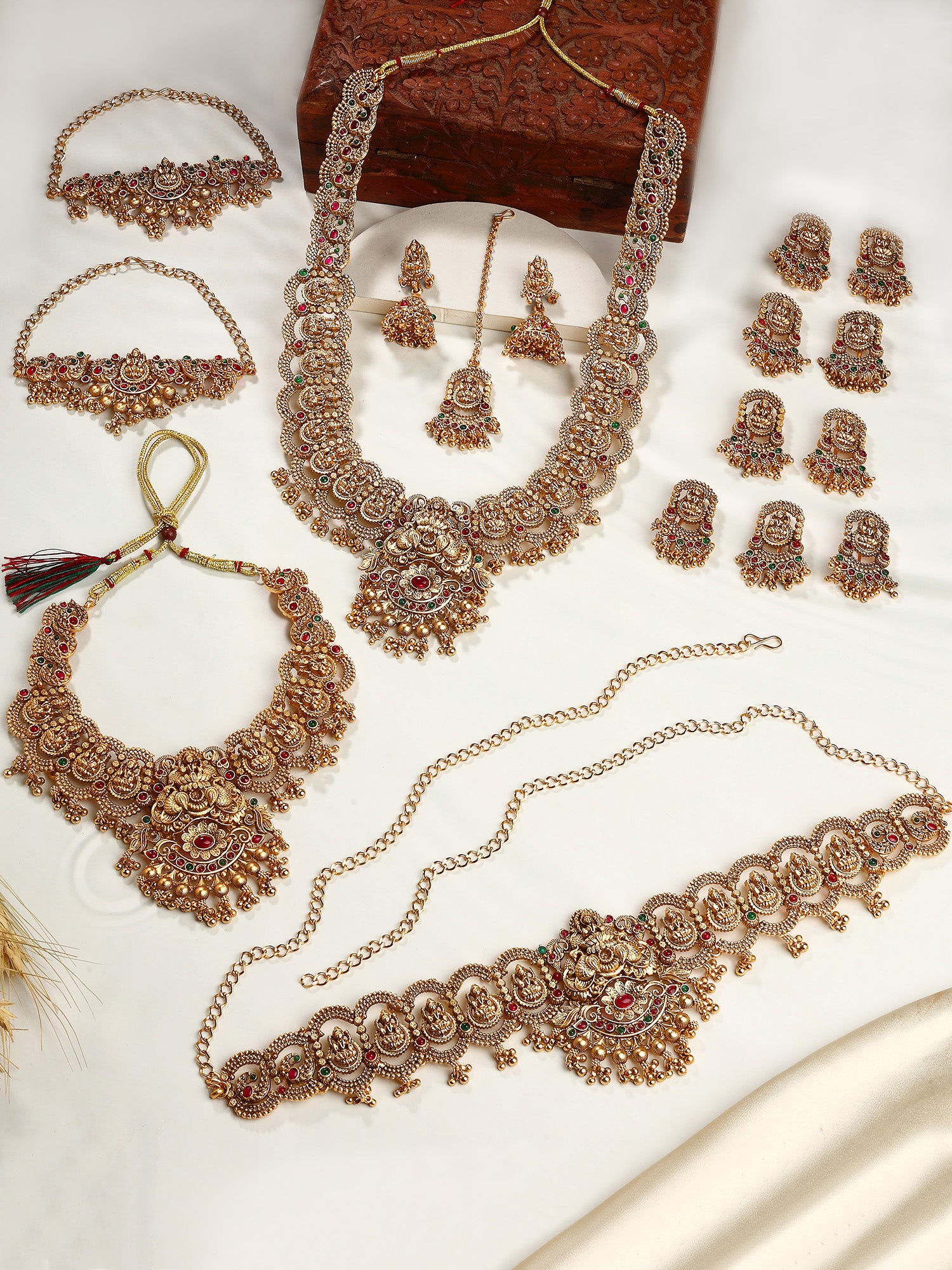 A temple jewellery set is ideal for brides who love traditional South Indian or heritage-inspired looks. Inspired by temple architecture and deity motifs, these designs often feature Lakshmi, peacocks, and intricate carvings.