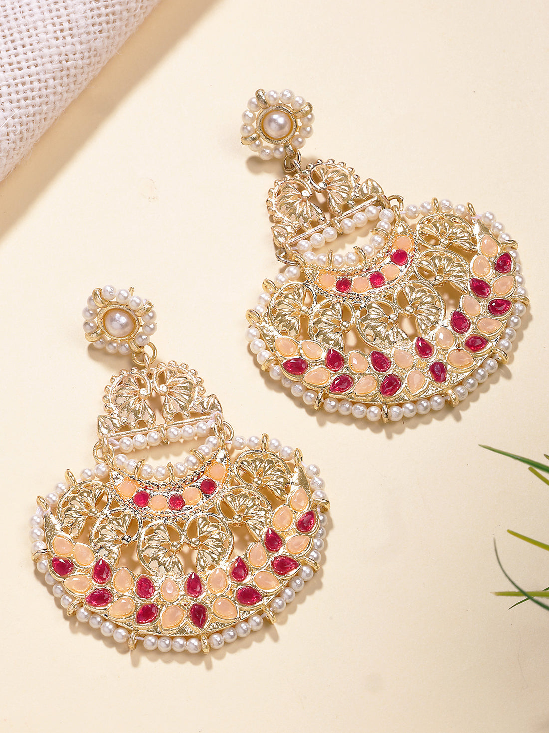 Karatcart Gold Plated Red Beads and Pearl Kundan Chandbali Earrings for Women