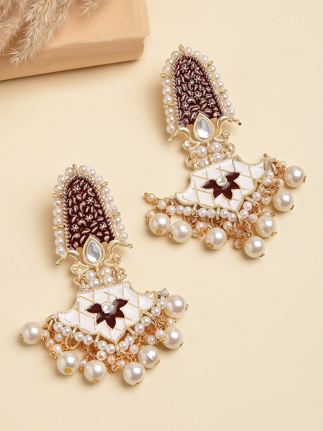 Karatcart Designer Gold Plated Maroon Meenakari Floral Kundan Dangler Earrings with Pearls