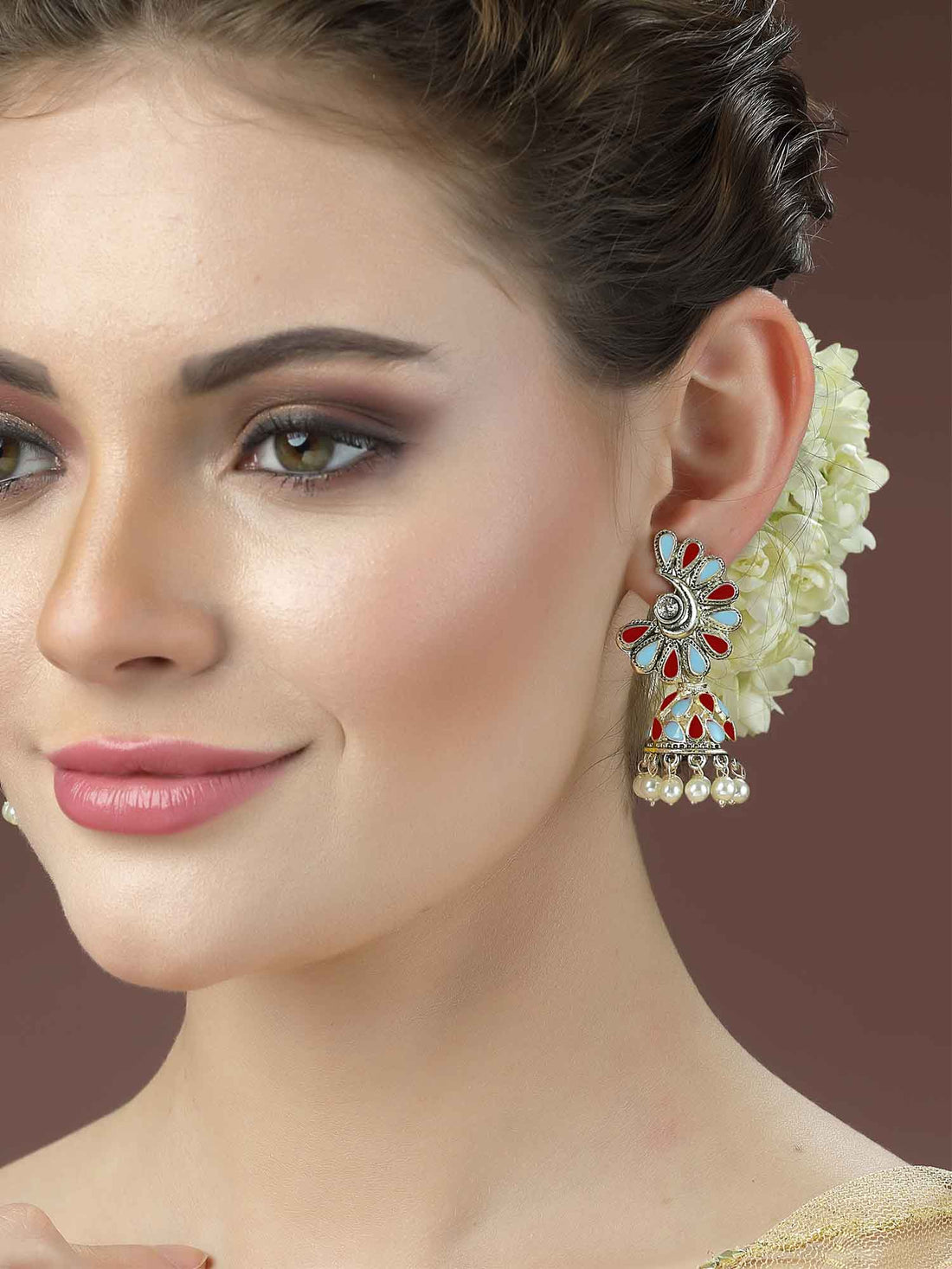 Karatcart Gold Plated Red and Light Blue Meena Jhumki Earrings for Women