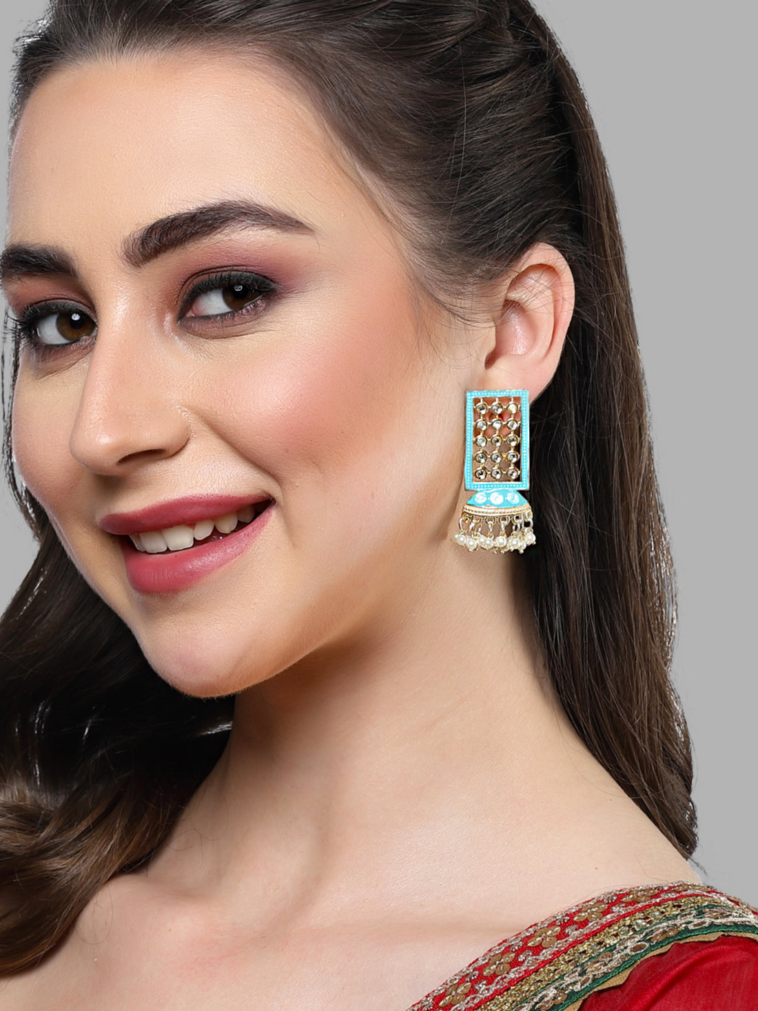 Karatcart Gold Plated Light Blue Meena Pearl Kundan Drop Earrings for Women