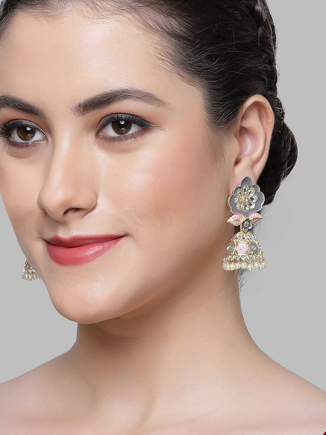 Karatcart Gold Plated Floral Design Grey and Pink Meena Kundan Jhumki Earrings for Women