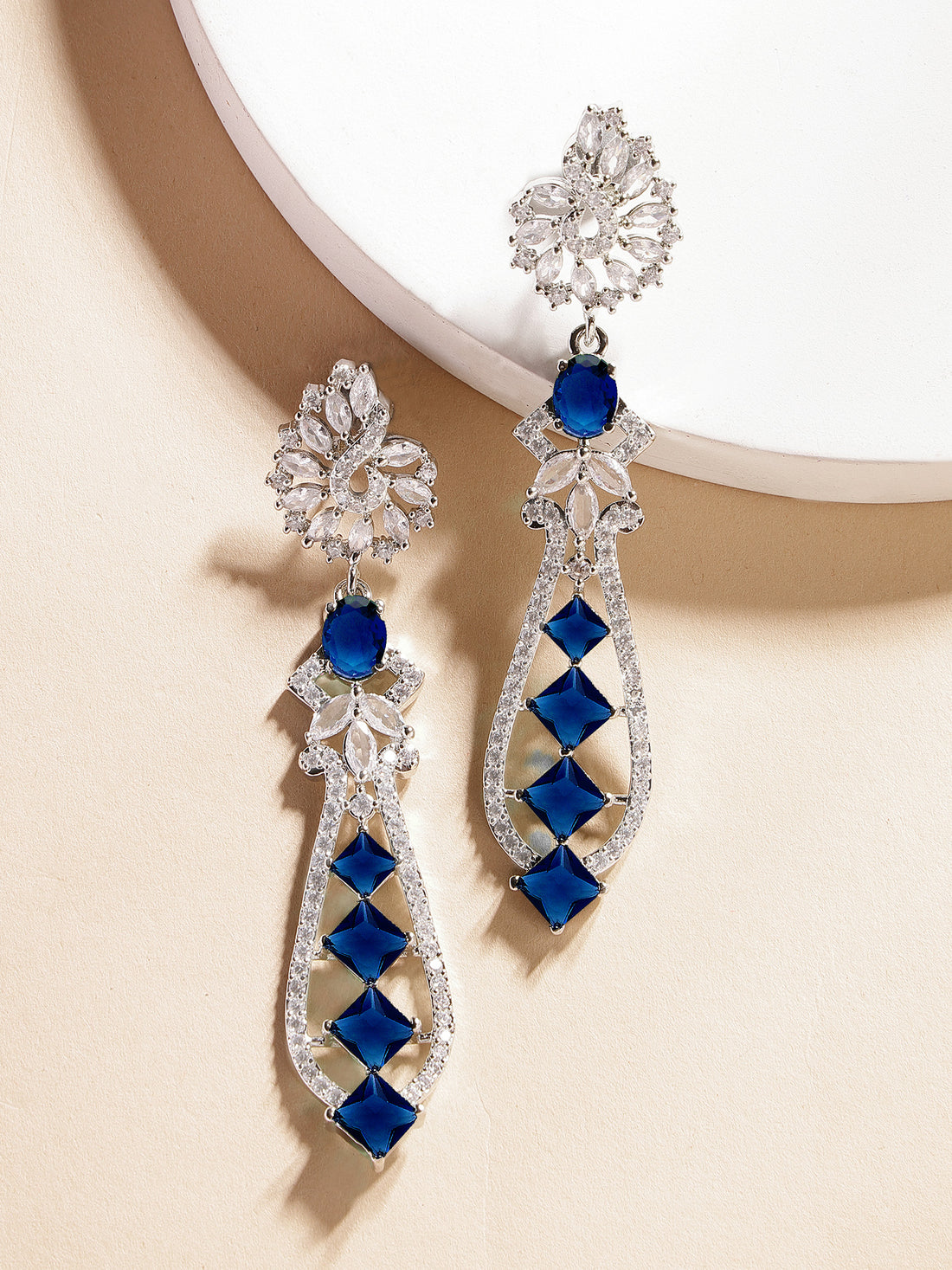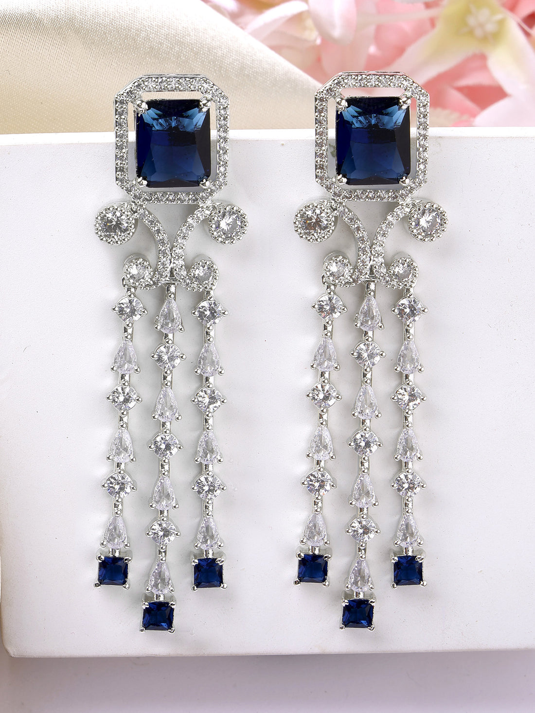 Karatcart Luxurious Blue American Diamond Stone Drop Earrings in Silver Plating for Women