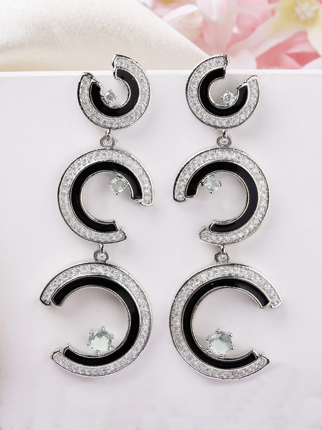 Karatcart Bold Black Enamel Silver Plated Crescent Green American Diamond Dangle Earrings