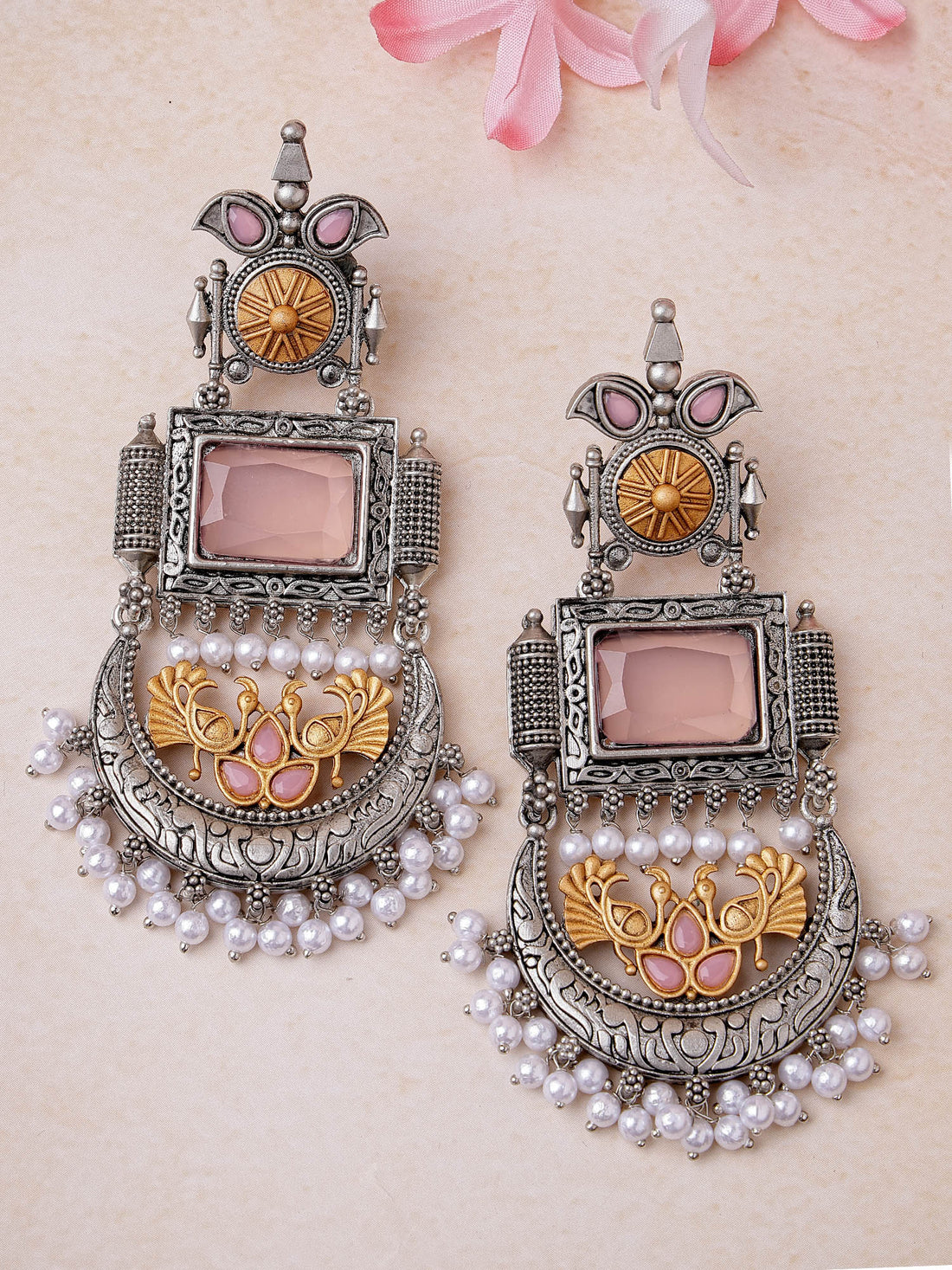 Karatcart Oxidised Silver and Gold Plated Pink Stone Drop Earrings for Women