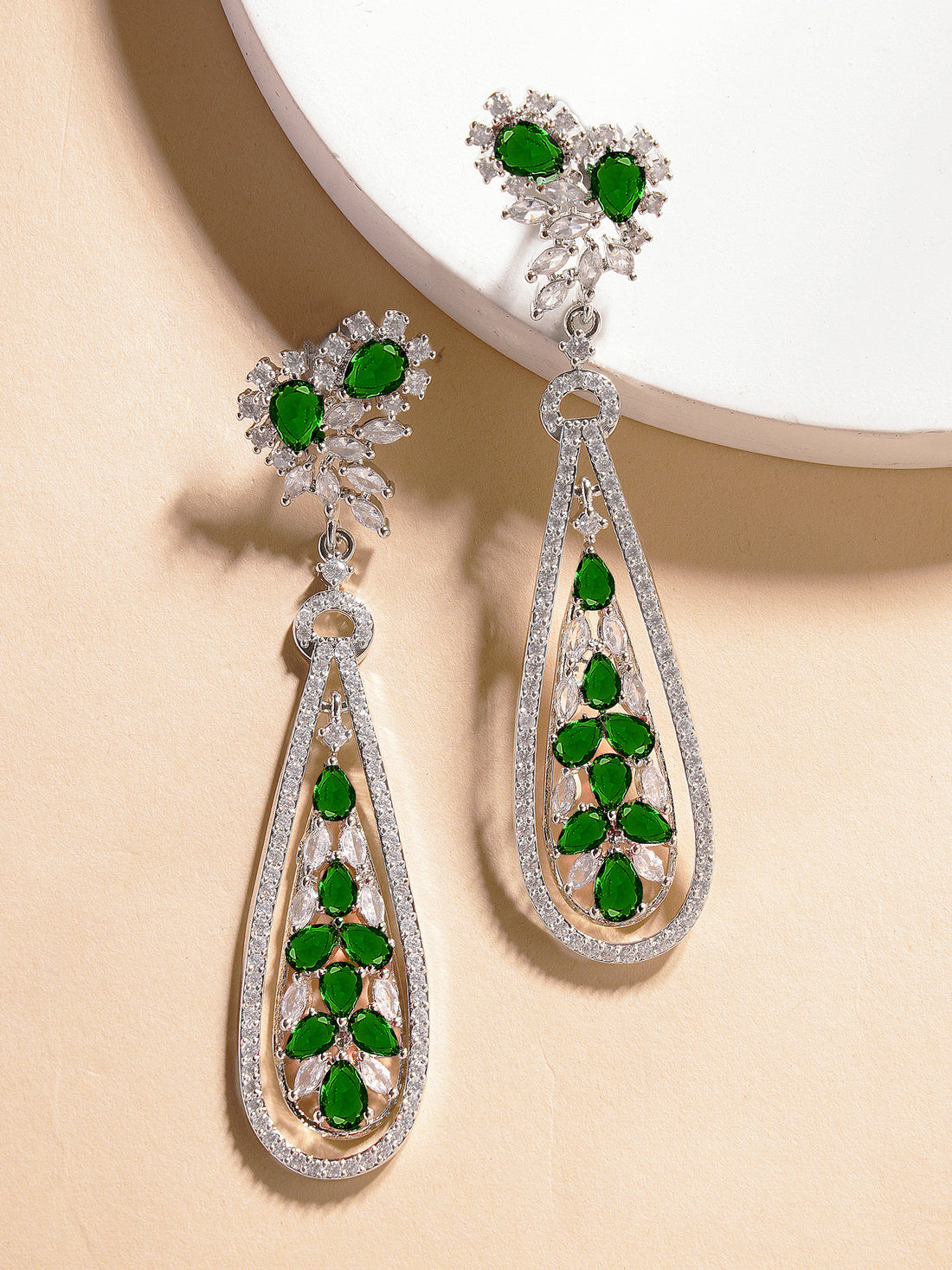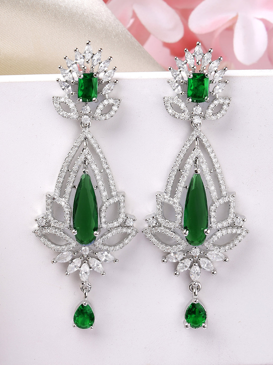Karatcart Luxurious Green American Diamond Stone Drop Earrings in Silver Plating for Women