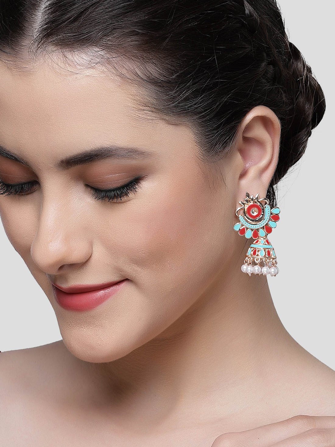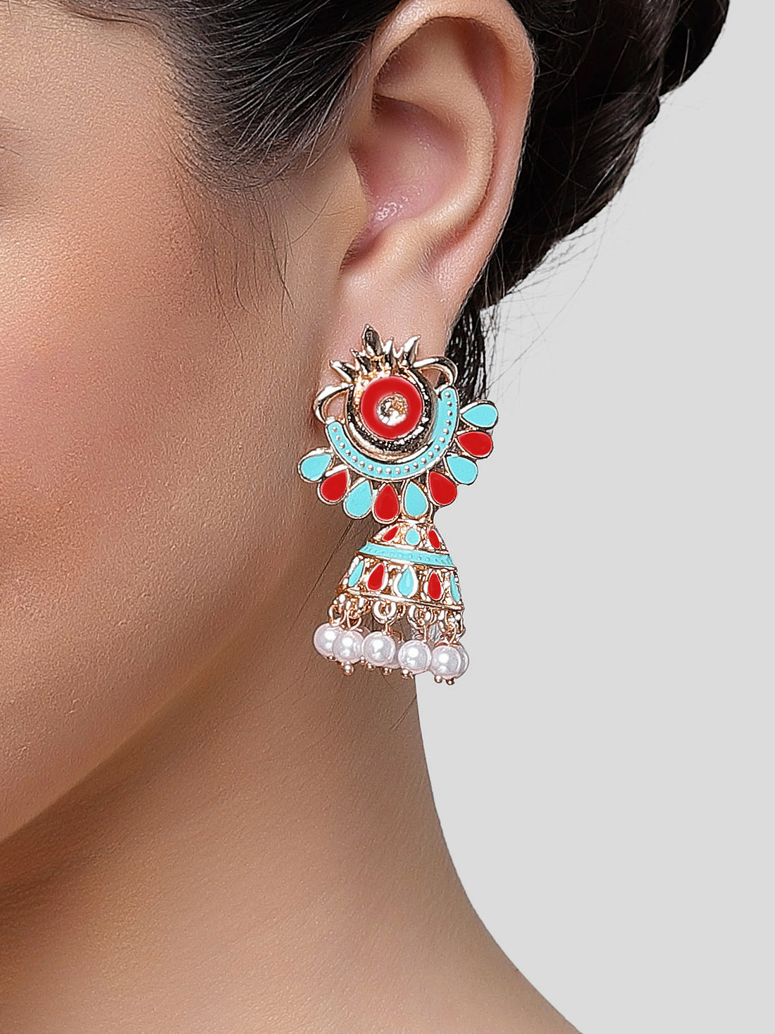 Karatcart Gold Plated Red and Light Blue Meena Jhumki Earrings for Women