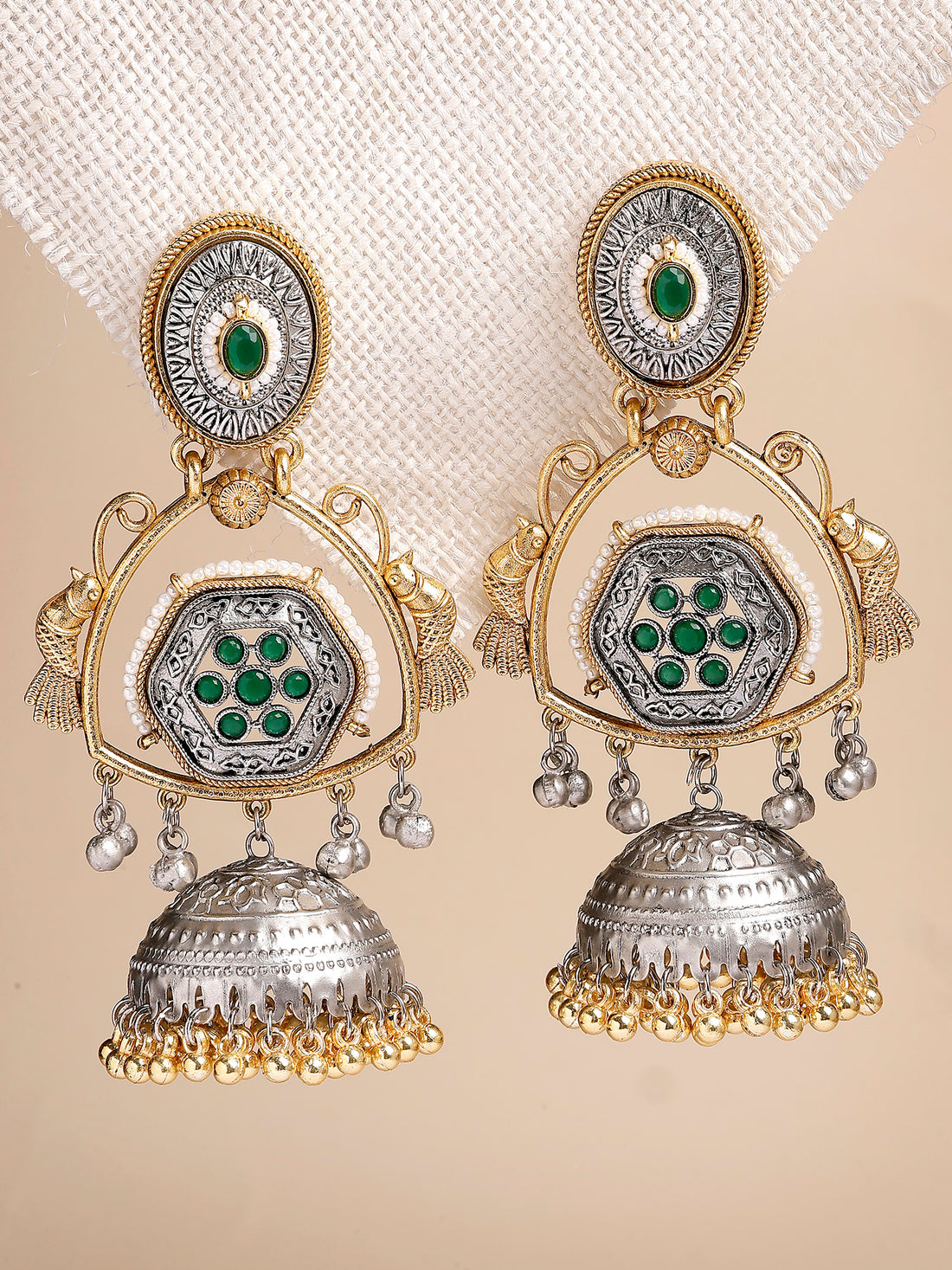Karatcart Designer Oxidized Silver and Gold Plated Green Stone Dual-Tone Jhumka Earrings