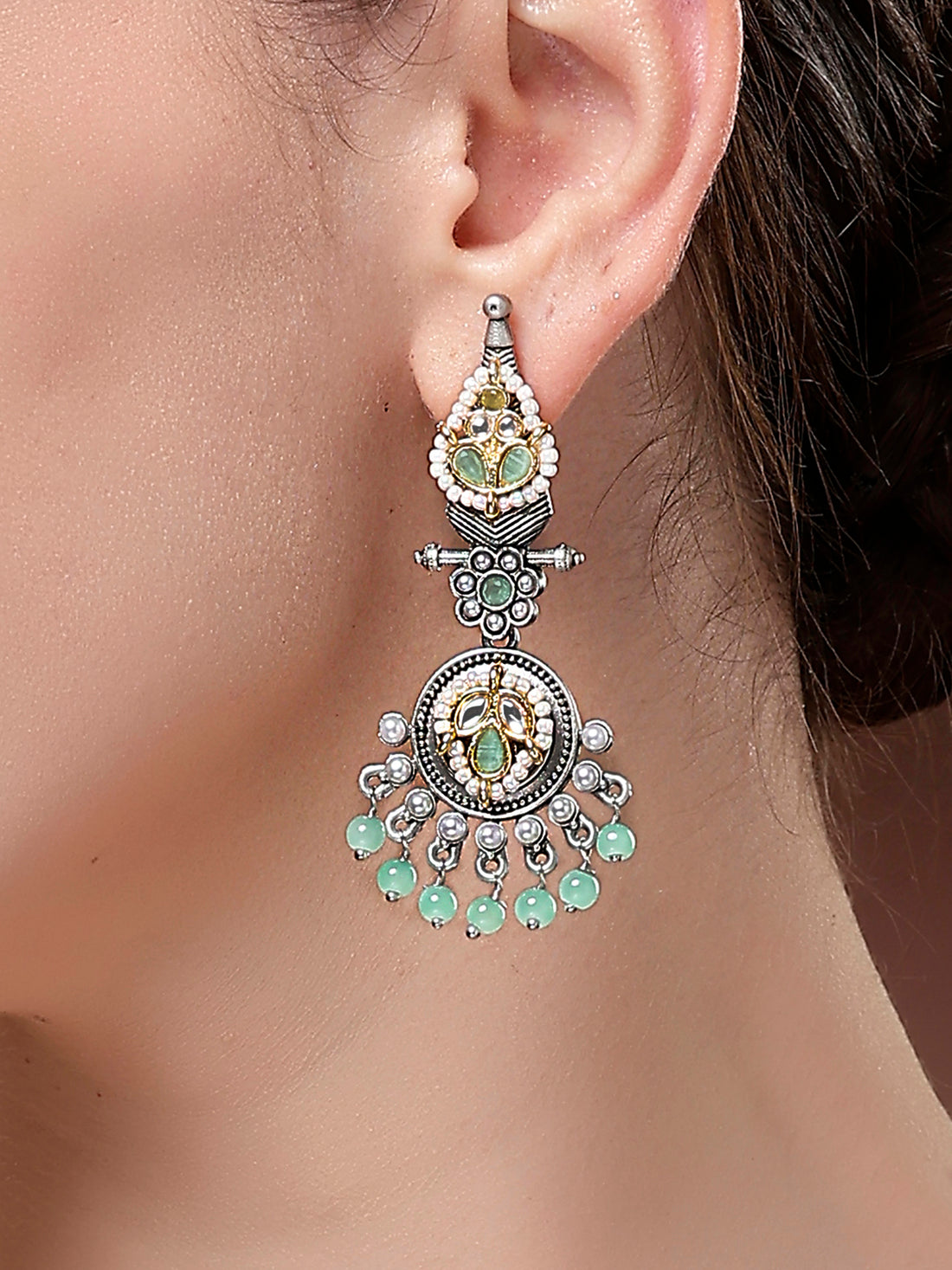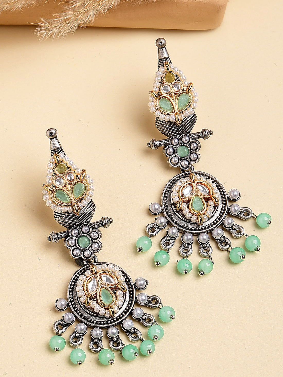 Karatcart Traditional Oxidized Silver Earrings with Mint Green Beads and Floral Motif