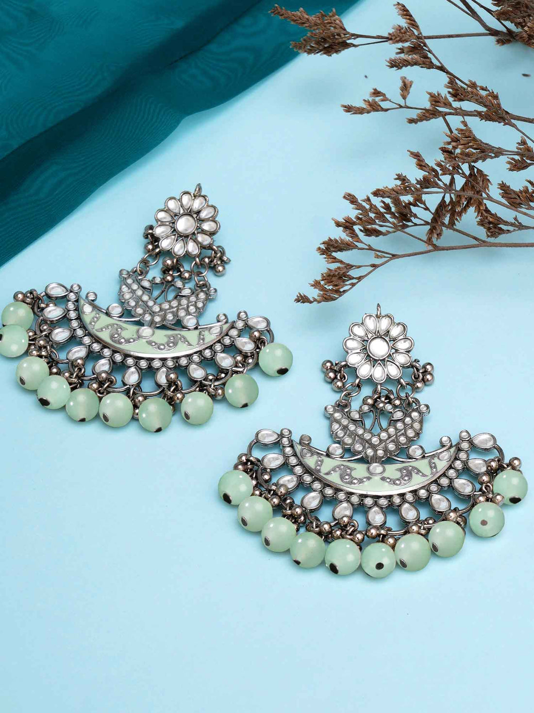 Karatcart Oxidised Silver Plated Green Beads and Kundan Studded Jhumki Earrings for Women