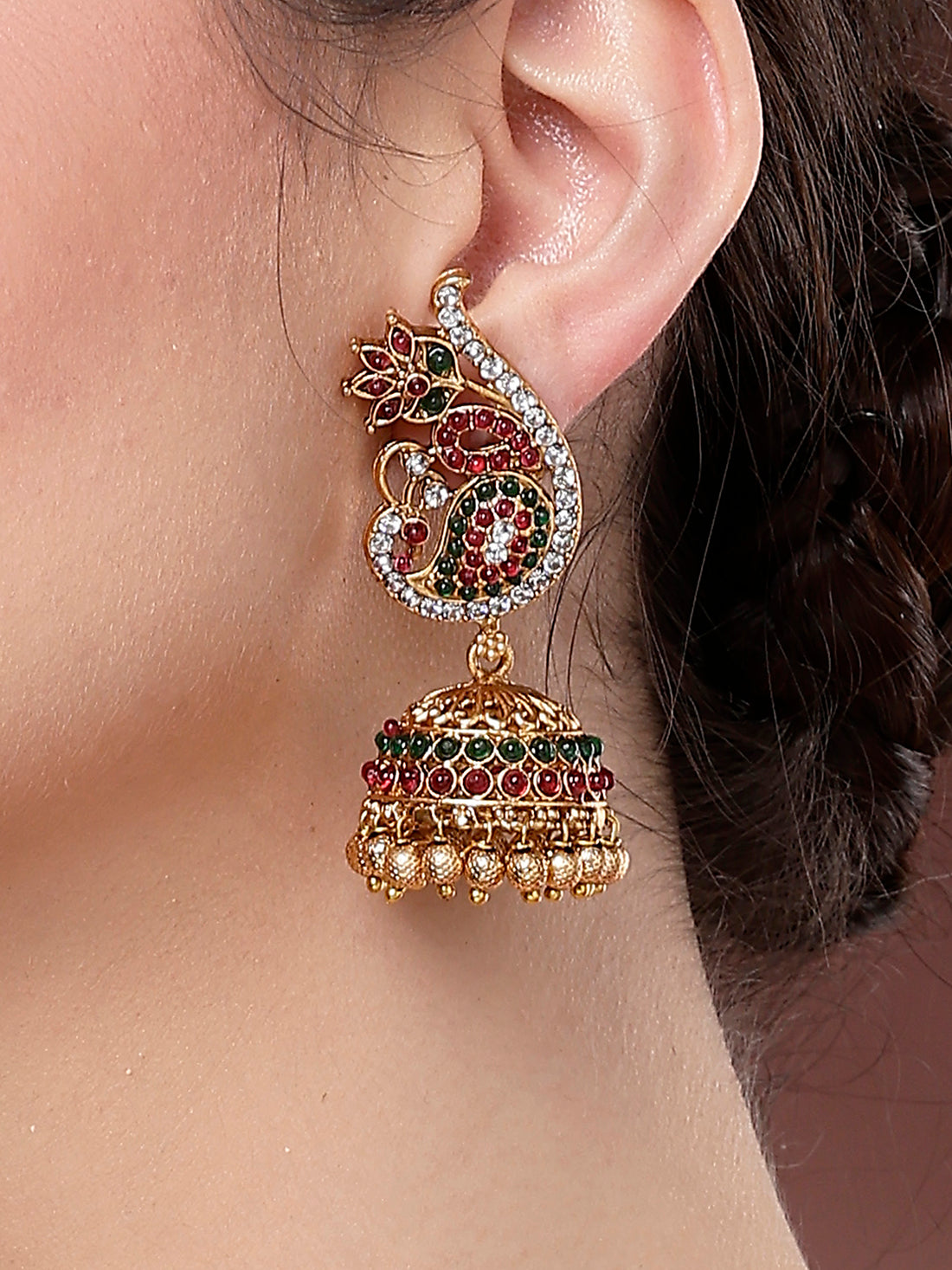 KARATCART Elegant Gold-Plated Peacock Motif Jhumki Earrings with Colorful Stones and Pearls for Women