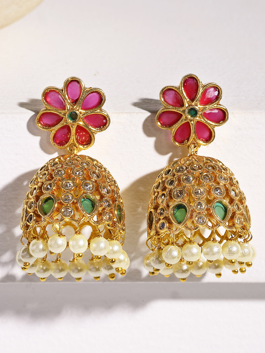 KARATCART Gold Plated Stone Jhumki Pink Earrings for Women