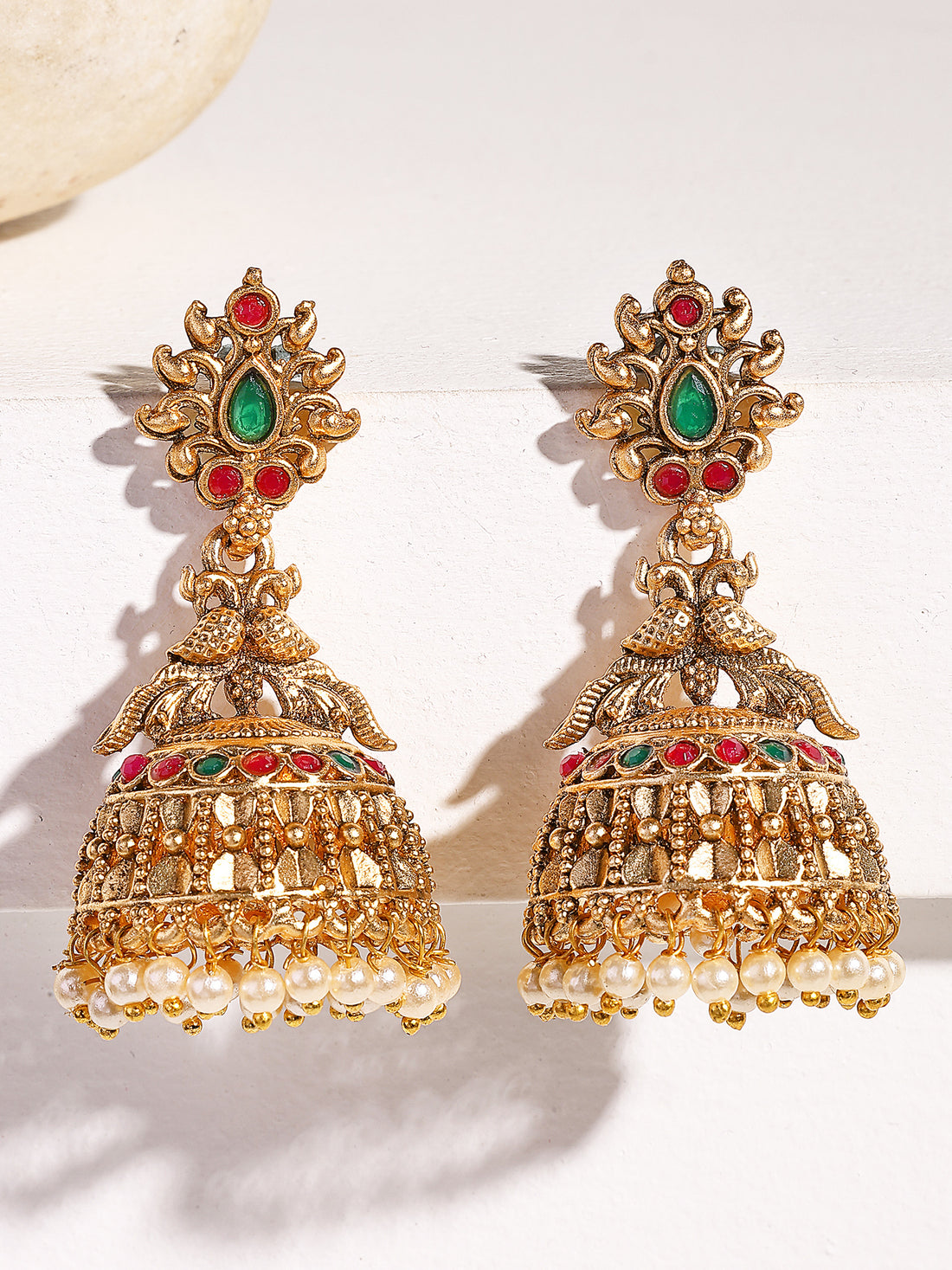 KARATCART Traditional Gold-Plated Jhumki Earrings with Red and Green Stones for Women