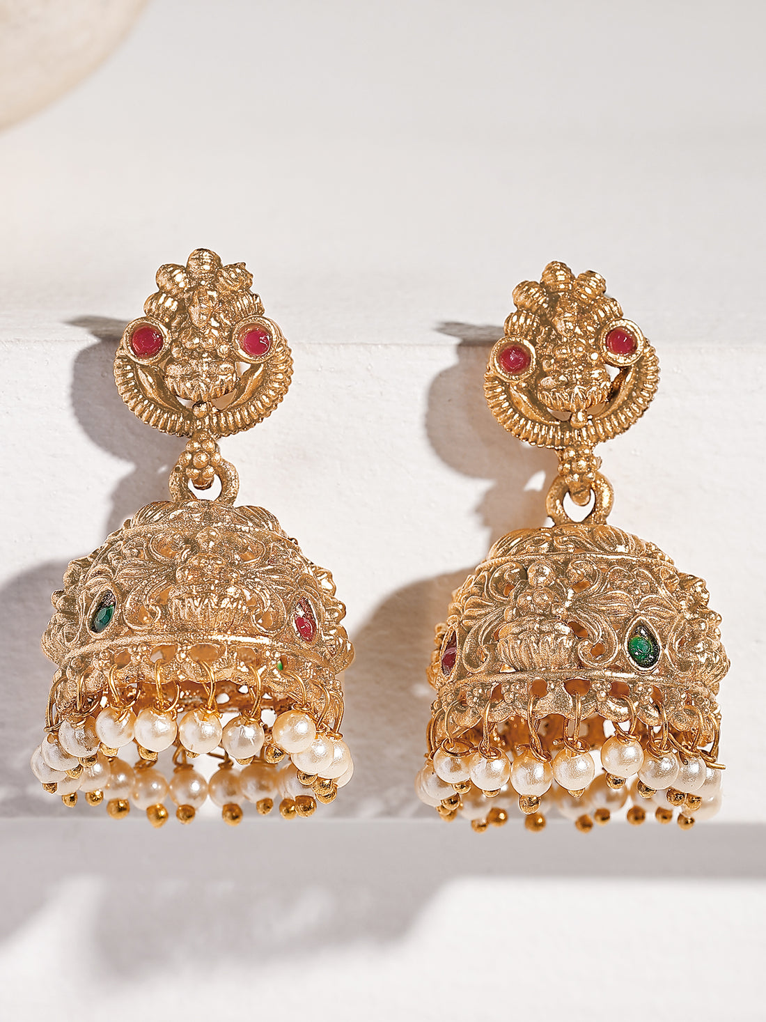 Karatcart Elegant Red and Green Stone Gold Plated Laxmi Mata Design Jhumki Earrings for Women