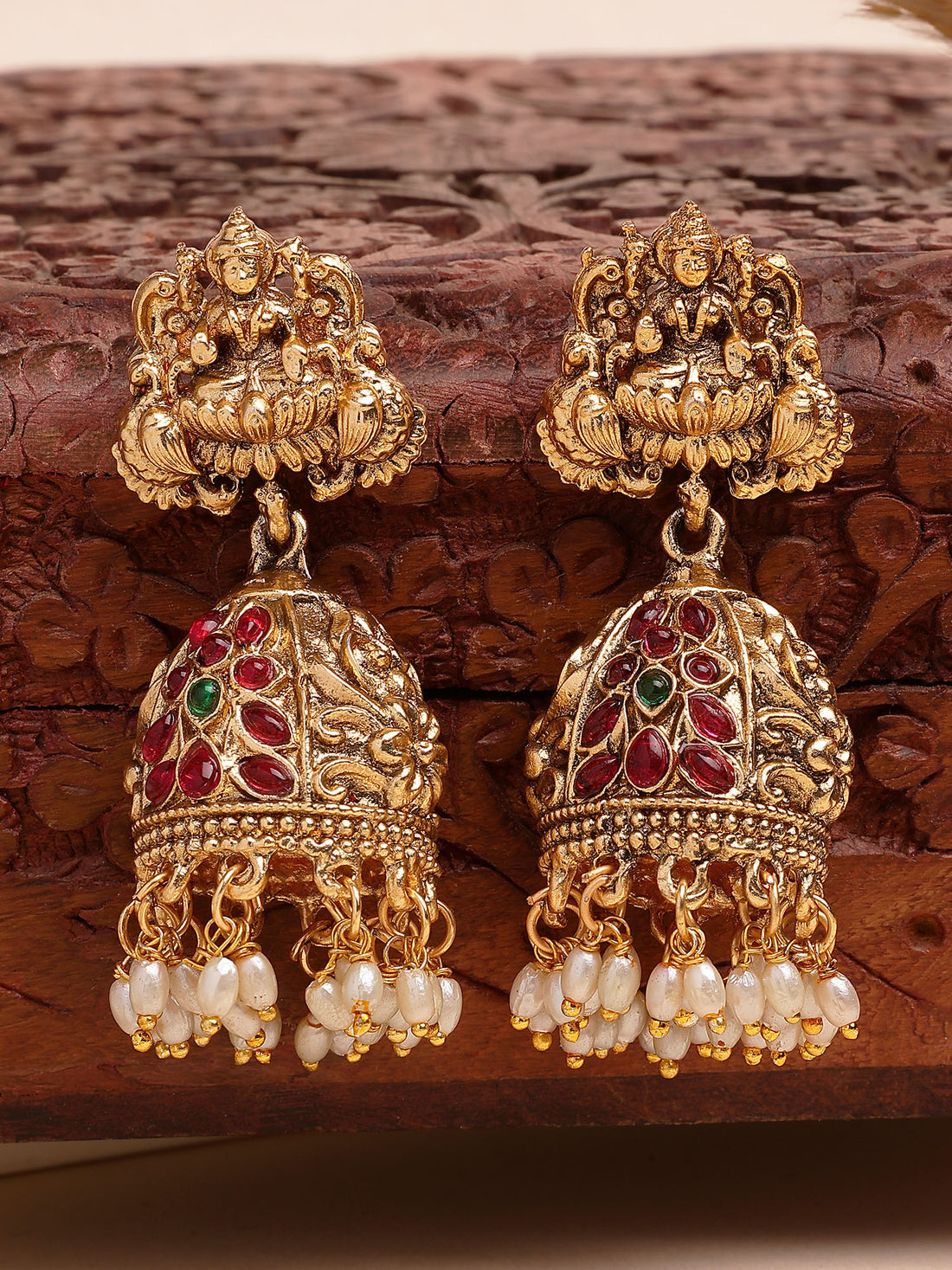 Karatcart Elegant Red Stone Gold Plated Laxmi Mata Design Jhumki Earrings for Women