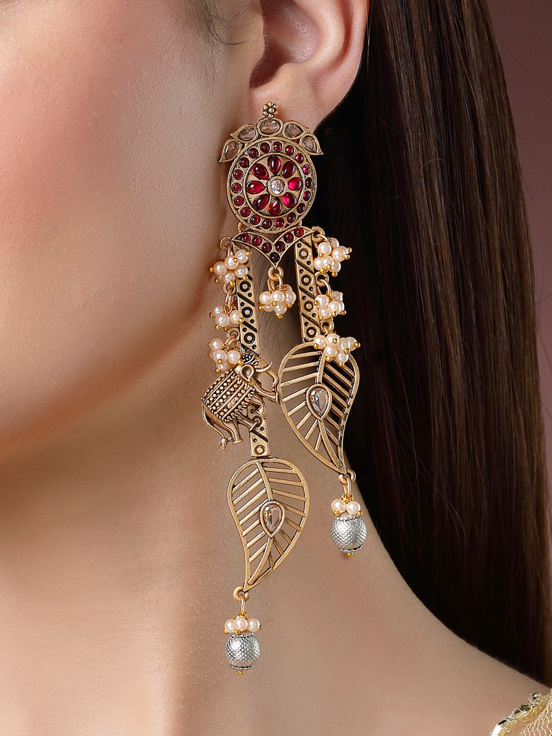 Karatcart Gold Plated Leaf Shape Red Stone Studded Drop Earrings for Women