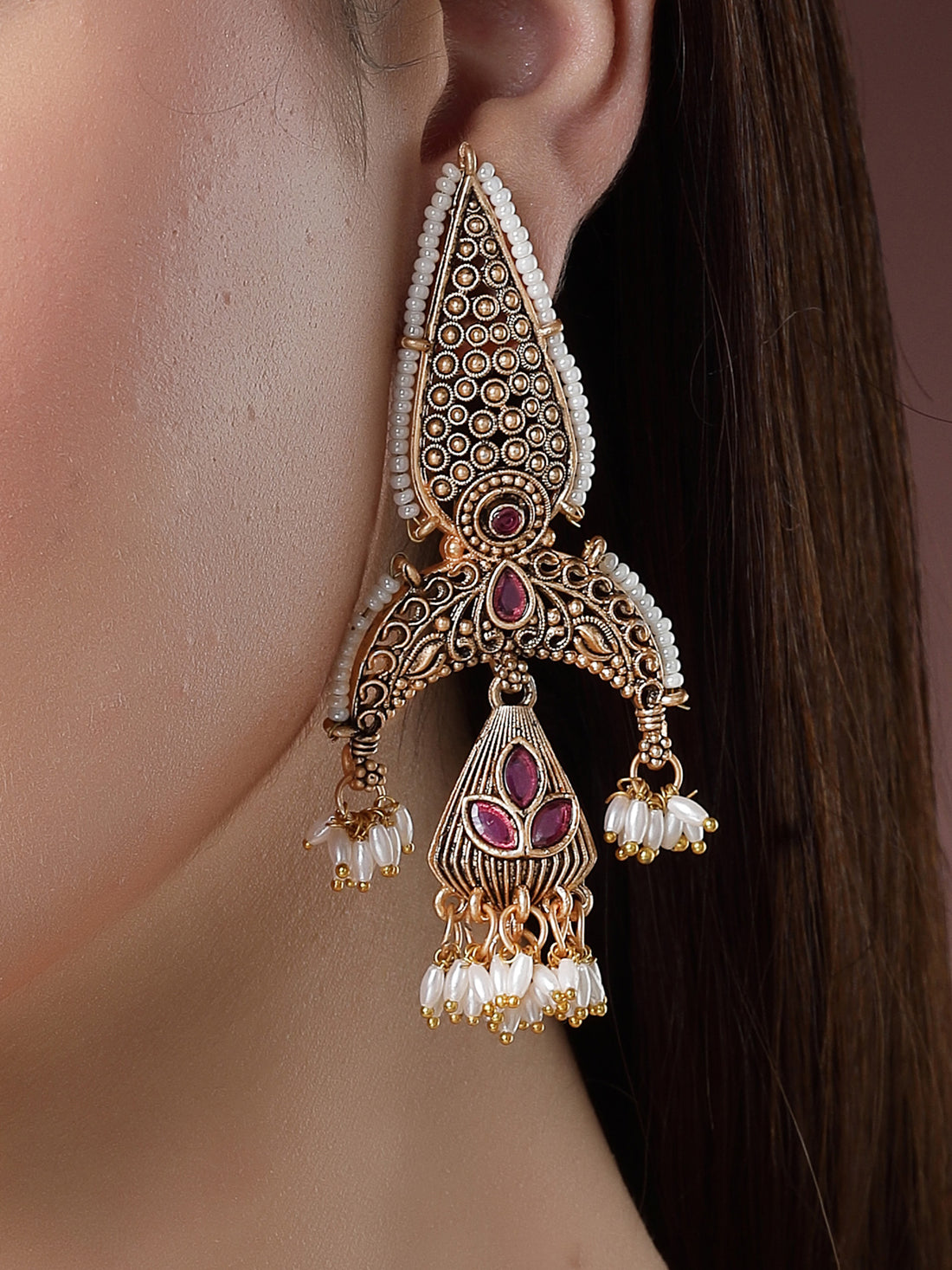 Karatcart Gold Plated Red Stone Studded Dangler Jhumki Earrings for Women