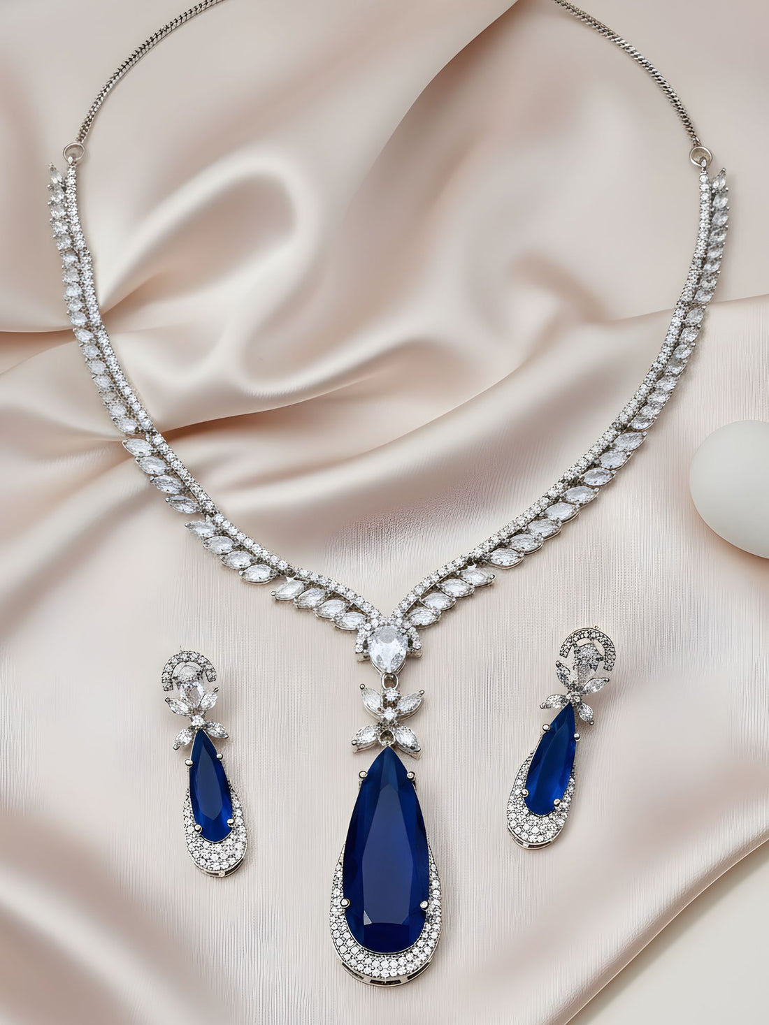 Karatcart Luxurious Blue Drop American Diamond Silver Plated Necklace Set for Women