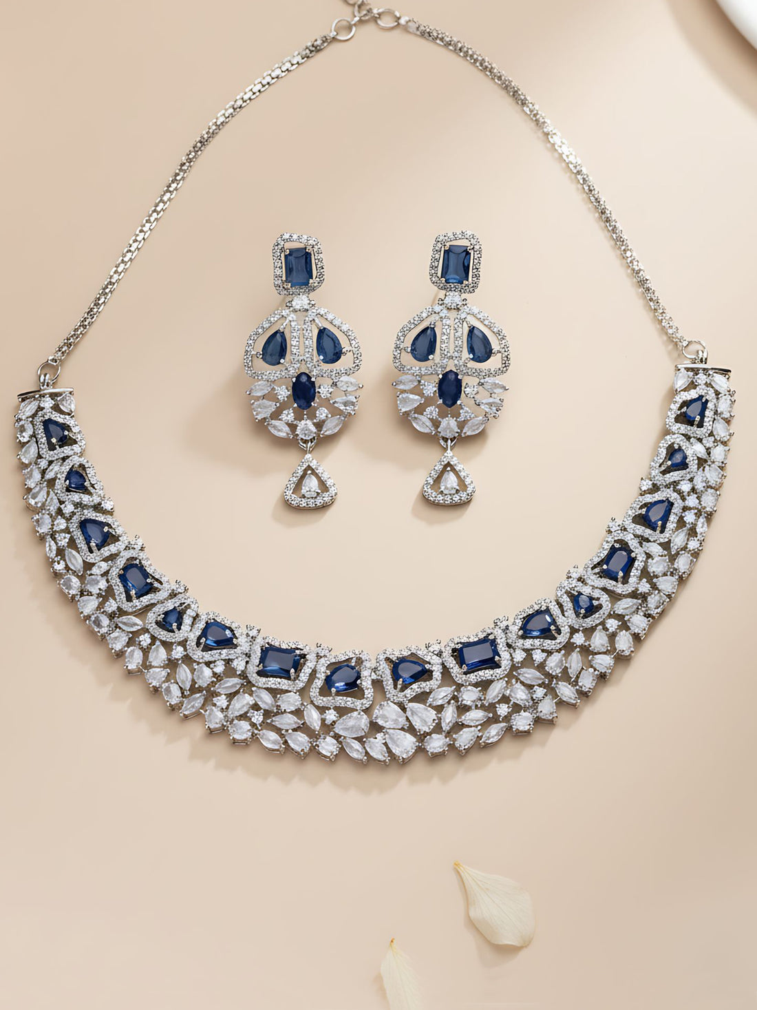 KARATCART Luxurious Blue American Diamond Silver-Plated Floral Jewellery Set for Women