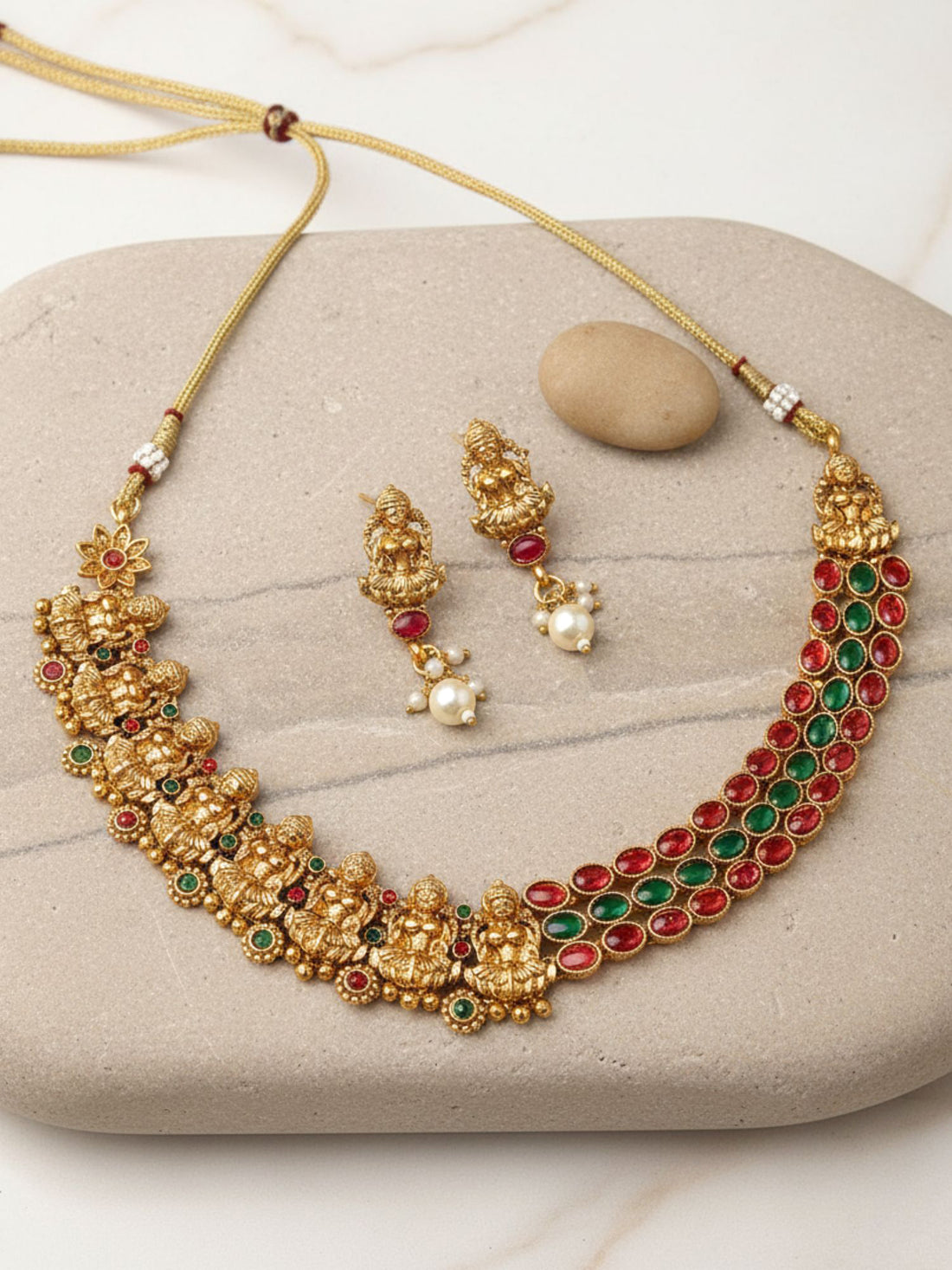 Karatcart Gold Plated Red and Green Stone Laxmi Mata Temple Jewellery Set for Women. Our...