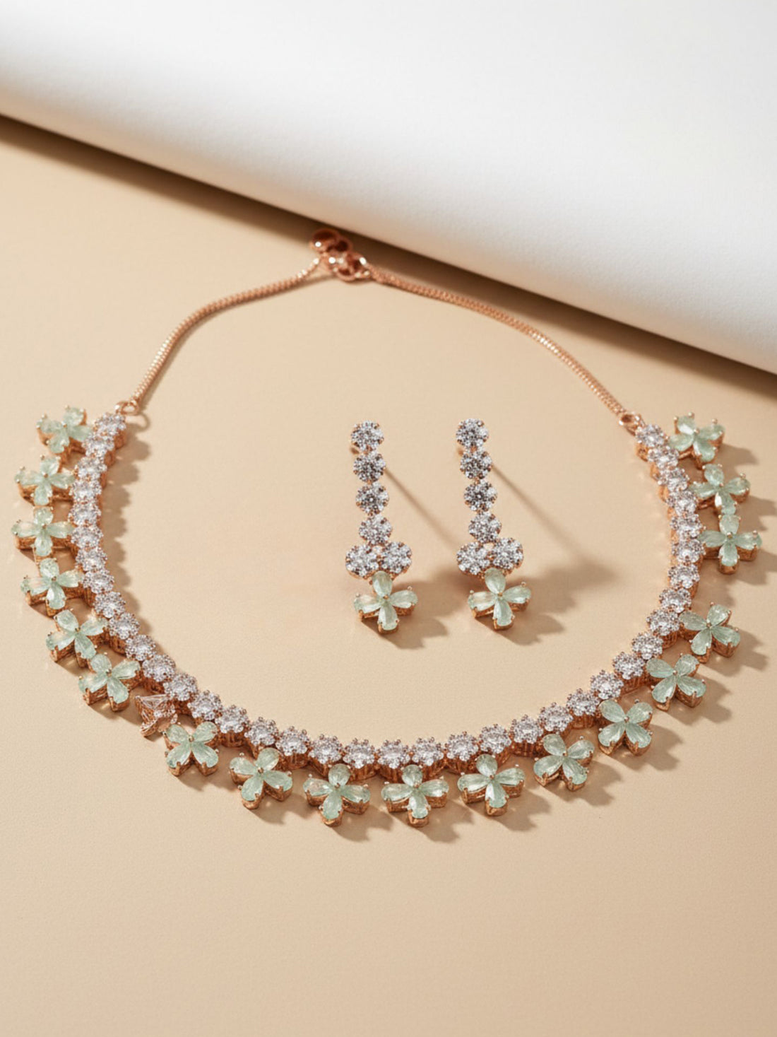 Rose Gold Plated White and Lime Green Cubic Zirconia Studded Necklace Set For Women. It...
