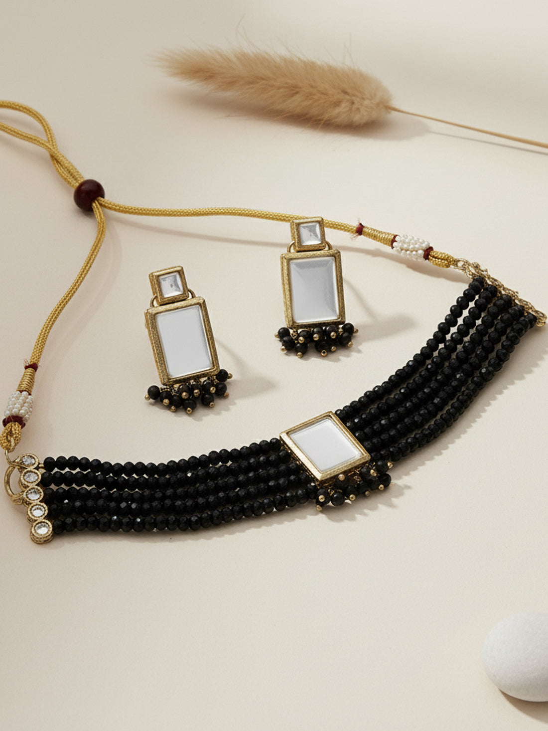 Traditional Black Crystal Kundan Choker Necklace Set. Best when paired with Indian or Indo Western Attire....