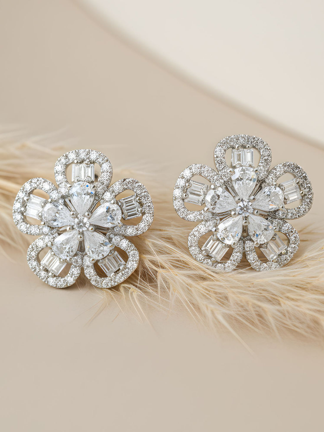 KARATCART Sparkling American Diamond Silver-Plated Floral Stud Earrings for Women