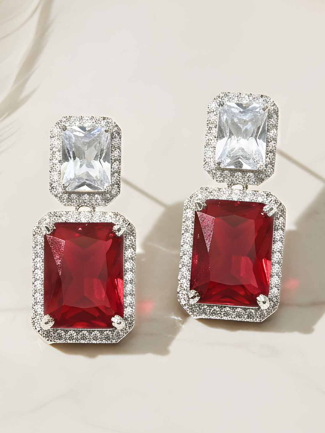KARATCART Sparkling Red American Diamond Silver-Plated Emerald-Cut Drop Earrings for Women