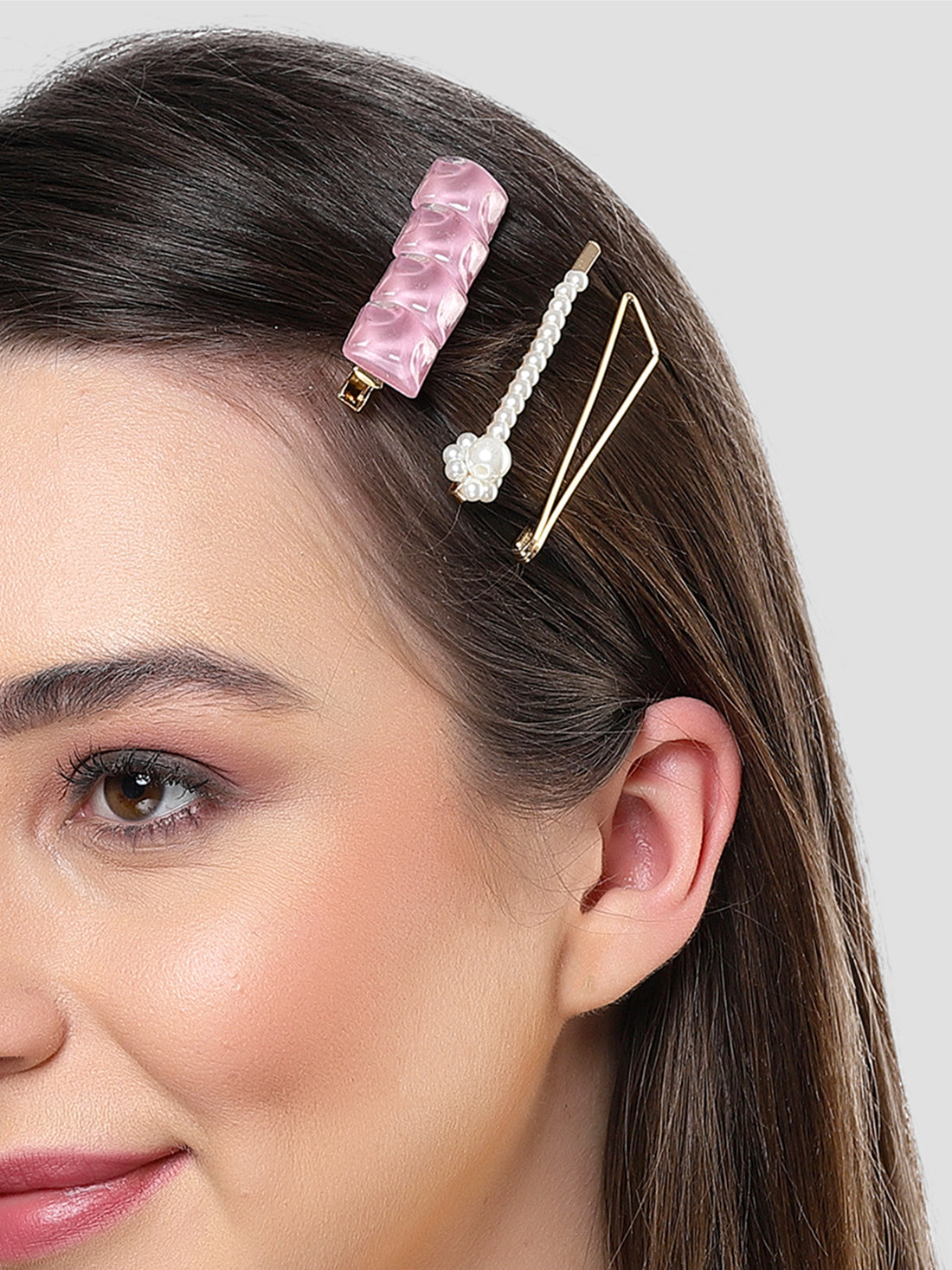Bohey by KARATCART Set of 3 Pink and White Pearl Beaded Hair Clips for Women