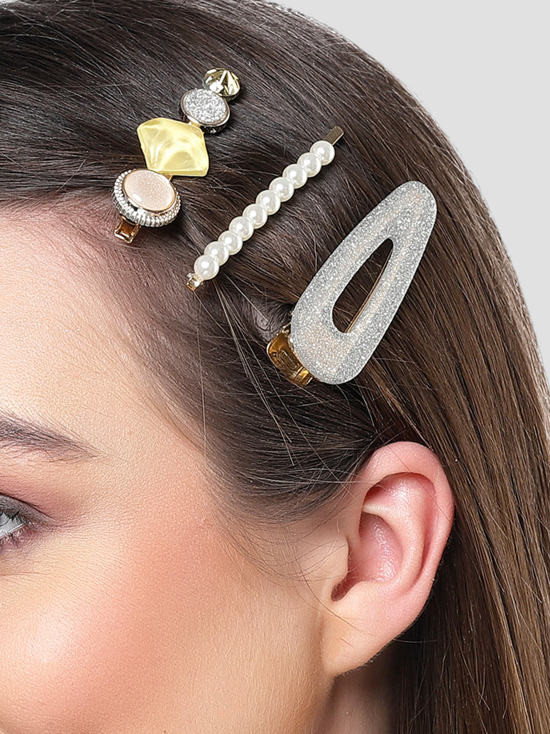 Bohey by KARATCART Set of 3 Gold Plated White Pearl and Crystal Studded Hair Clips for Women