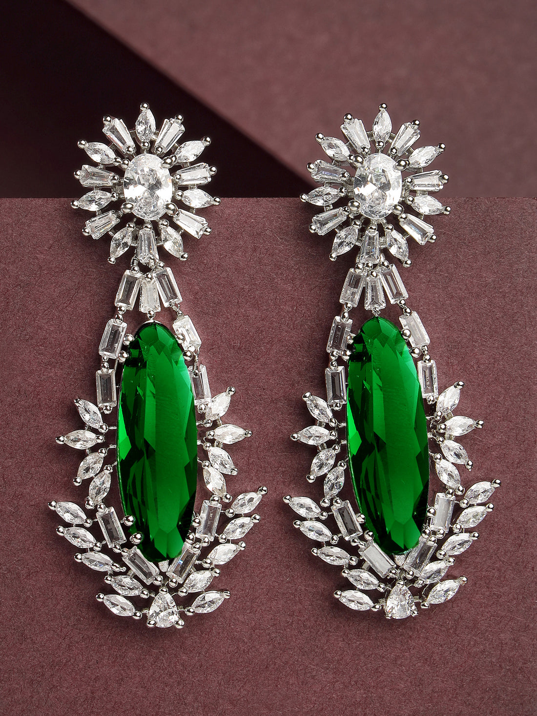 Karatcart Silver Plated Big Green American Diamond Studded Drop Earrings for Women