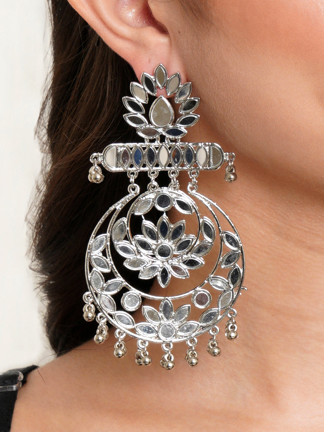 Karatcart Silver Plated Floral Design Mirror Work Long Dangler Earrings for Women