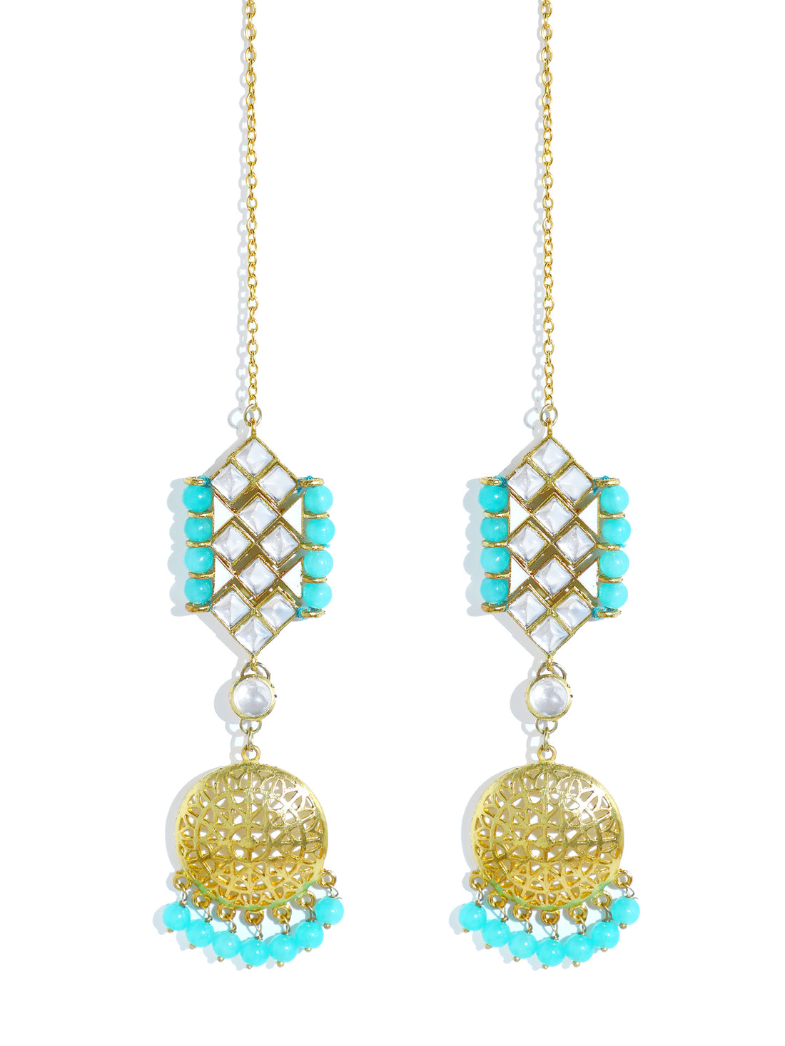 Gold Plated Mint Blue Beads Kundan Kaanchain Earrings for Women