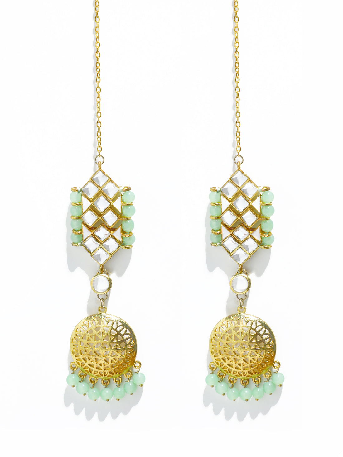 Gold Plated Mint Green Beads Kundan Kaanchain Earrings for Women