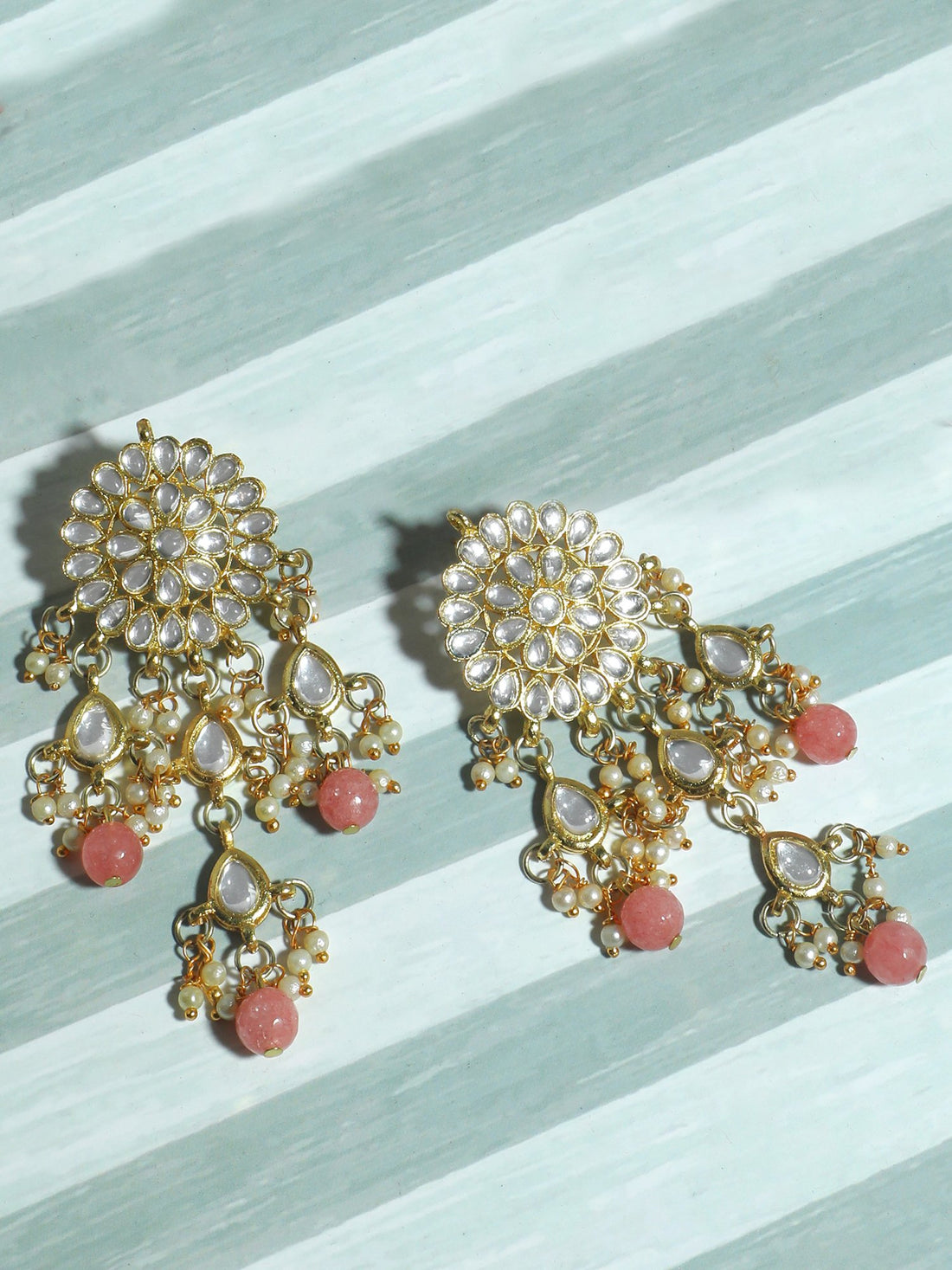 Gold Plated Peach Beads Kundan Dangler Earrings for Women