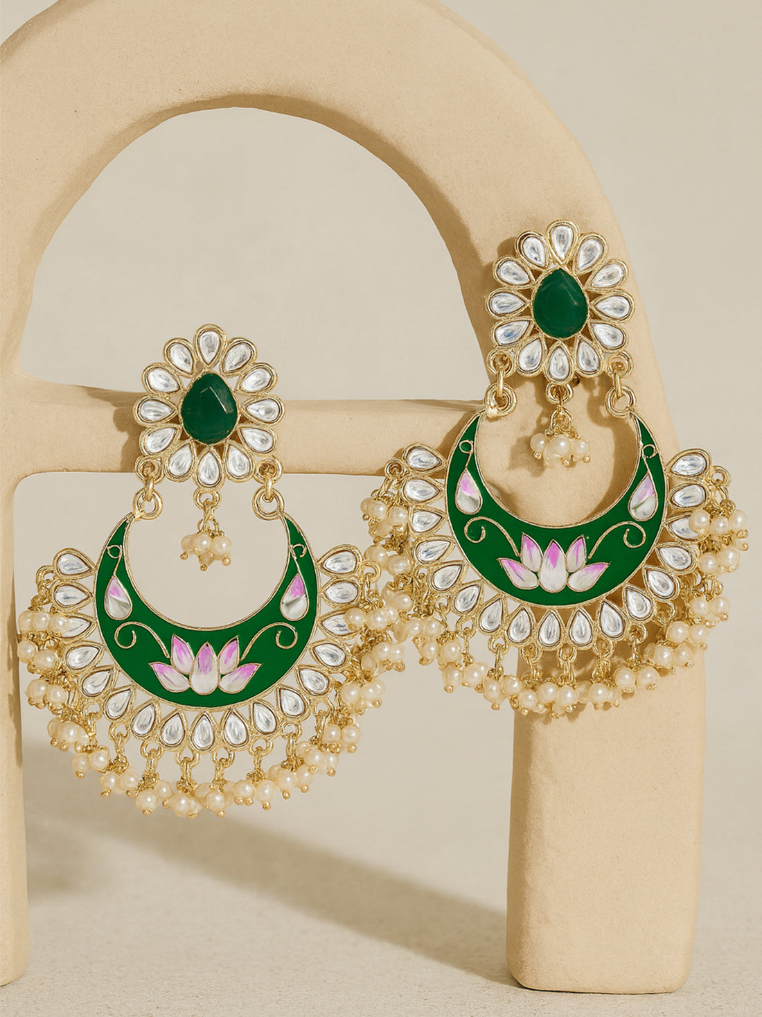 Karatcart Gold Plated Lotus Design Green Meena Kundan Dangler Earrings for Women