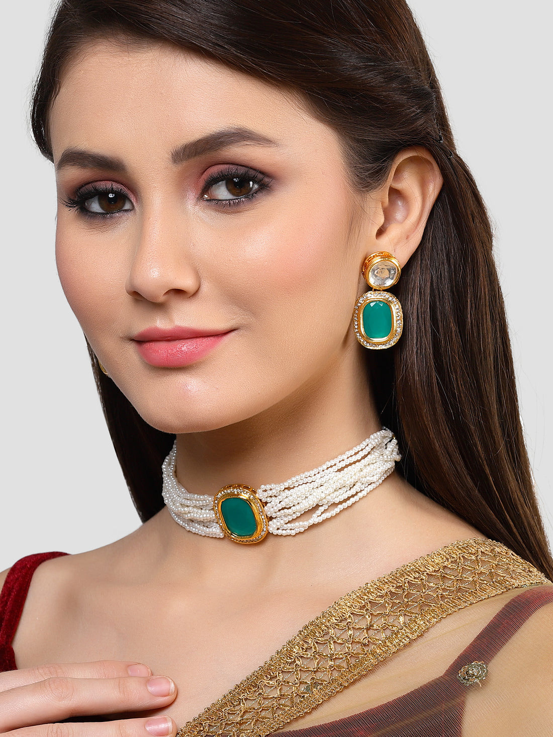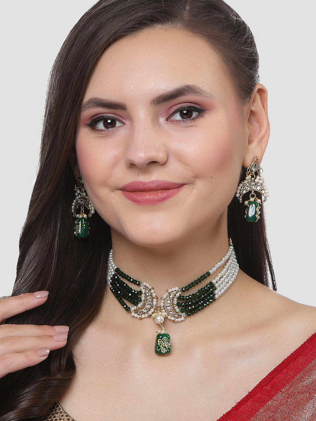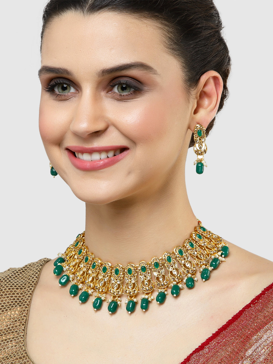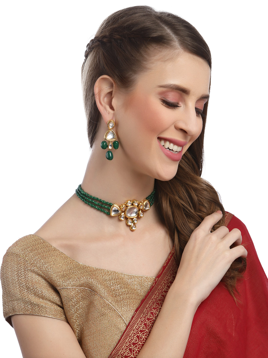 Karatcart Gold Plated Green Tumble Beaded Polki Choker Necklace Set