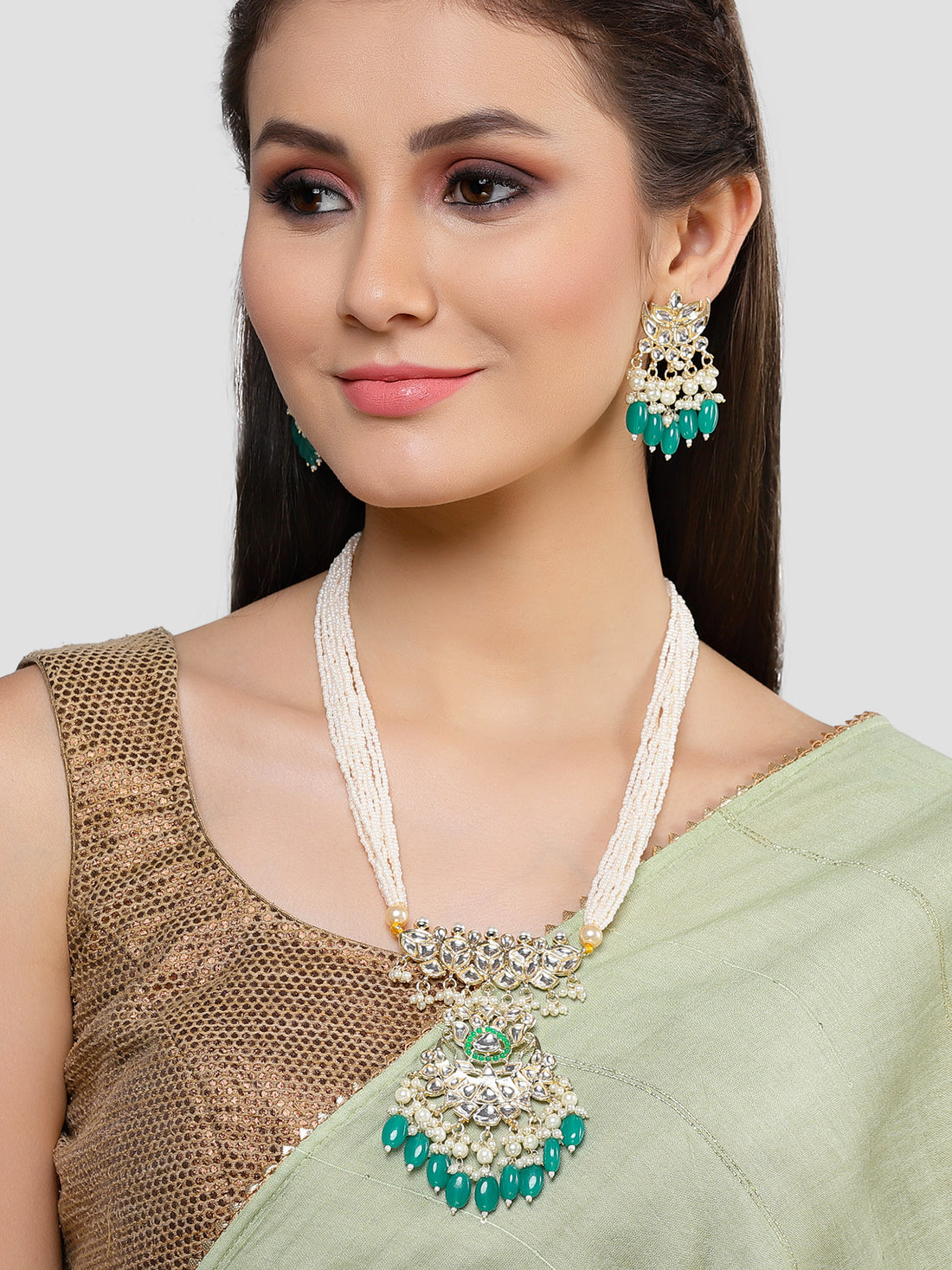Karatcart Gold Plated Green Tumble and Pearl Studded Kundan Long Rani Haar Necklace Set