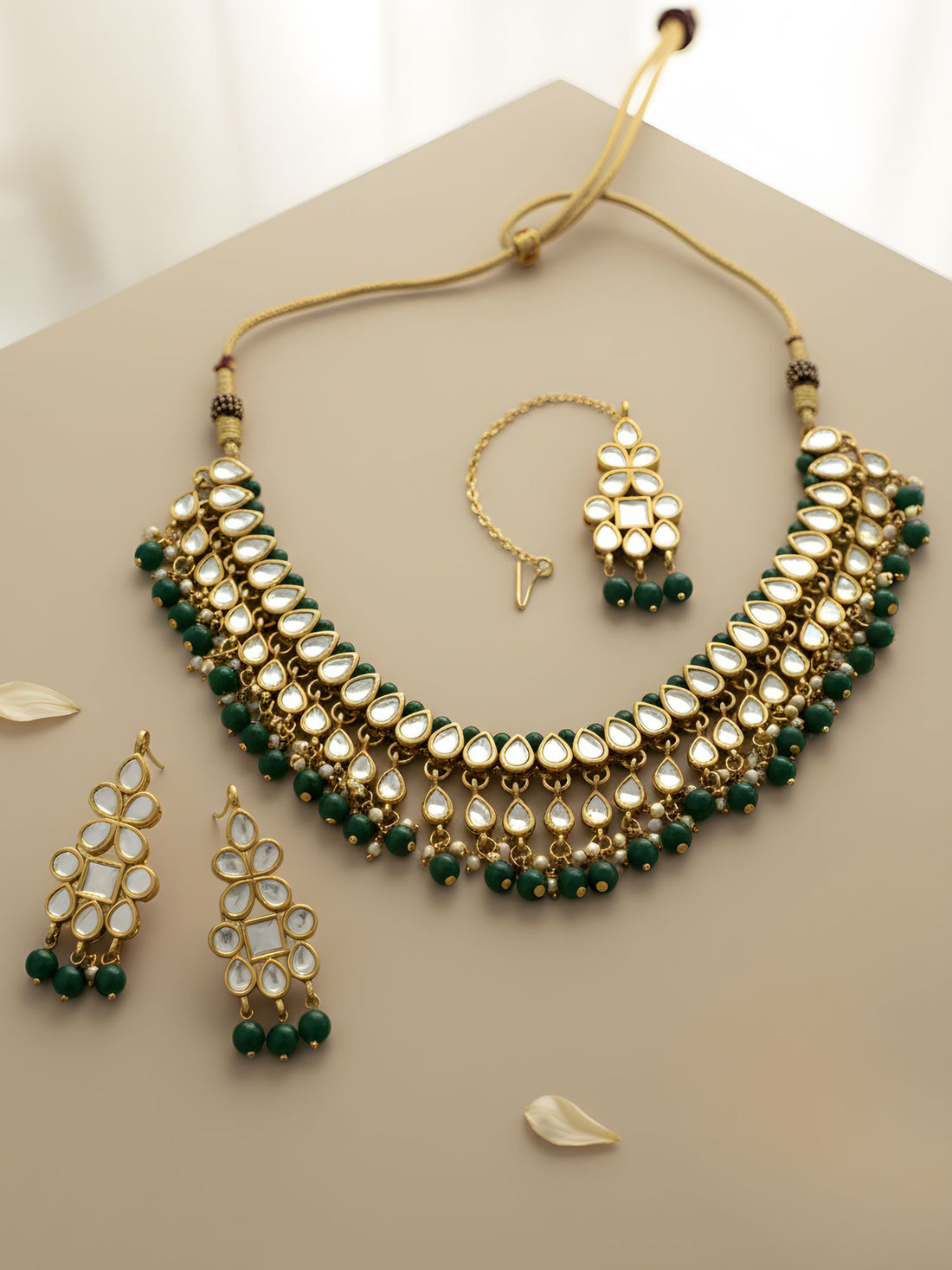 22K GoldPlated Partywear Traditional Kundan Pearl Bridal Green Choker Jewellery Set For Women Necklace Length...