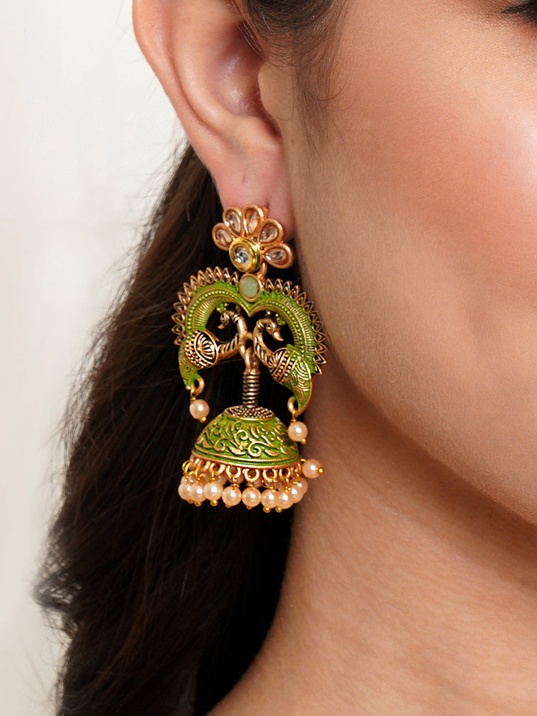 Karatcart Antique Gold Plated Kundan Studded Light Green Meena Peacock Flat Womens Jhumki Dangler Earrings