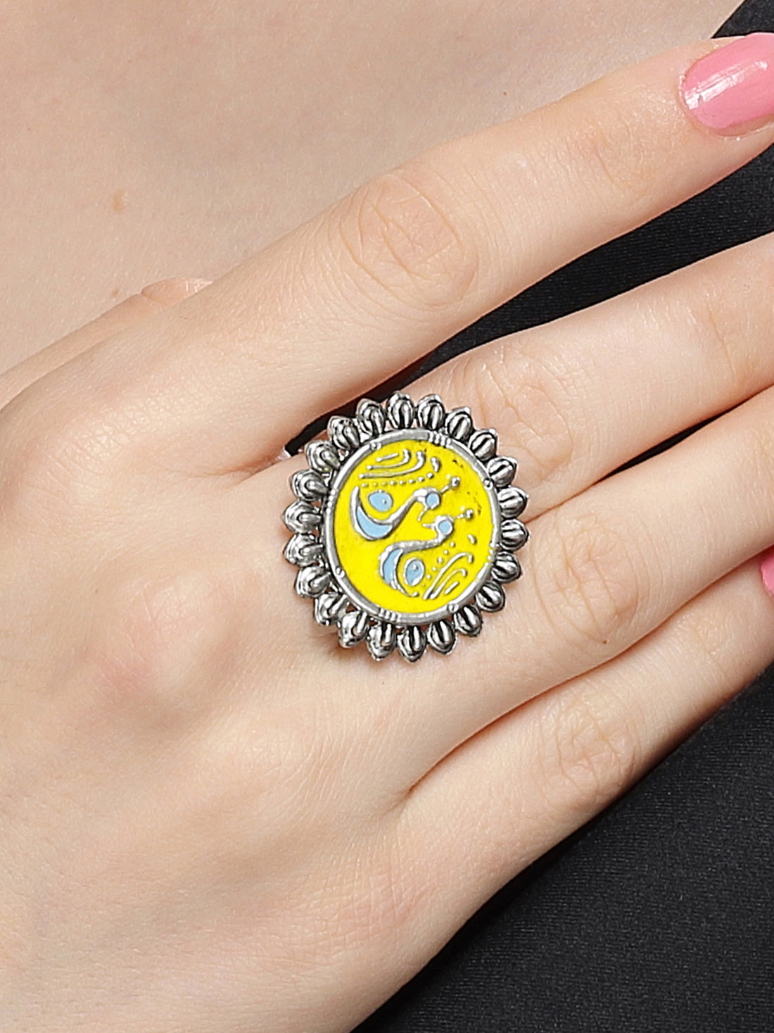 Karatcart Oxidised Silver Peacocok Design Yellow and Light Blue Meena Finger Ring for Women