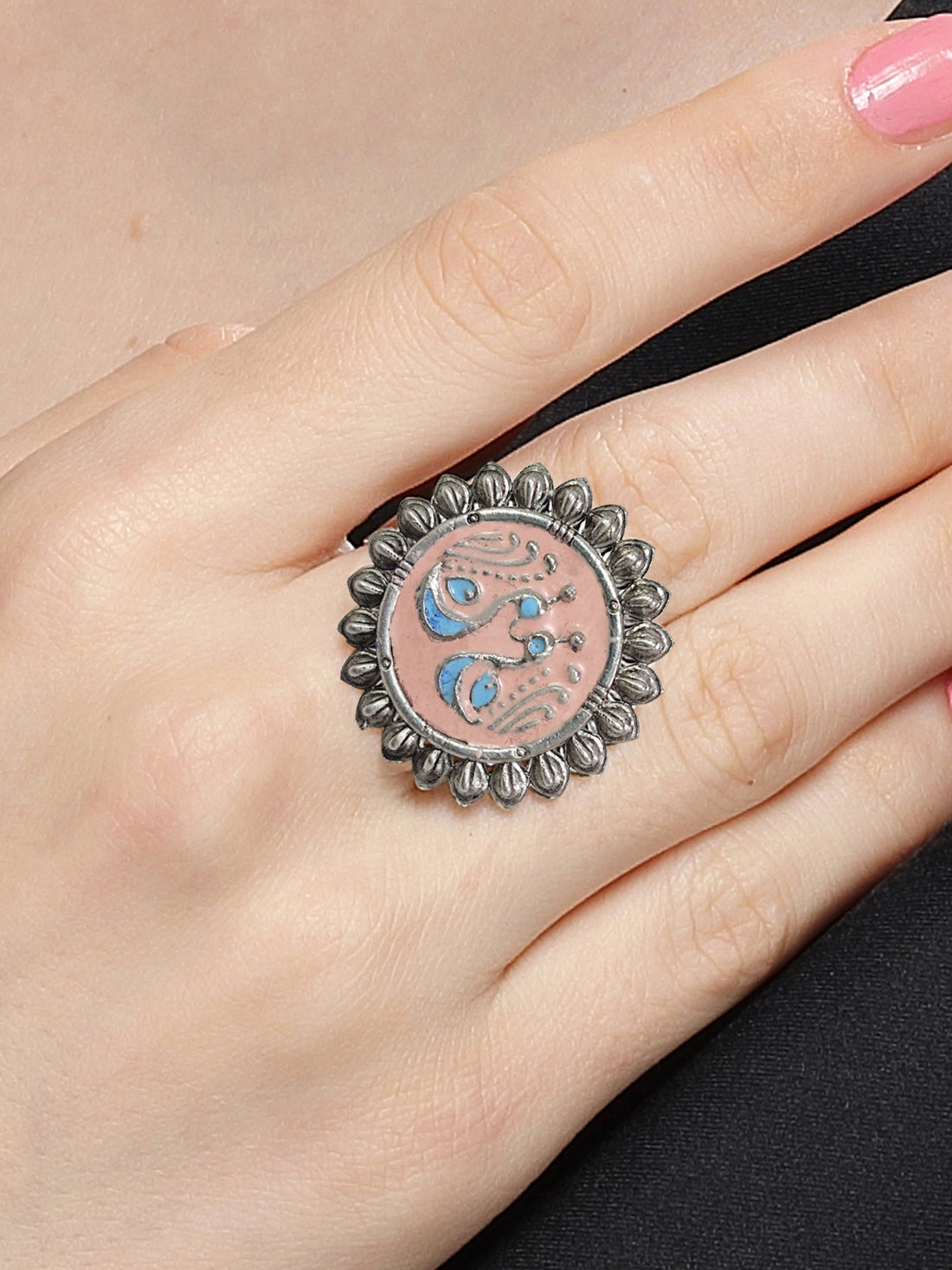 Karatcart Oxidised Silver Peacock Design Blue and Pink Meena Finger Ring for Women