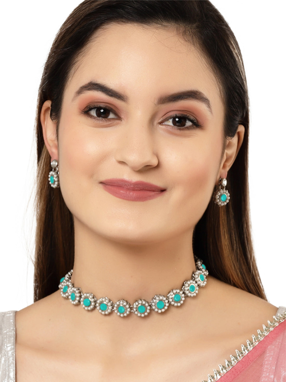 Karatcart Oxidised Silver Light Blue Kundan and Pearl Choker Necklace Set