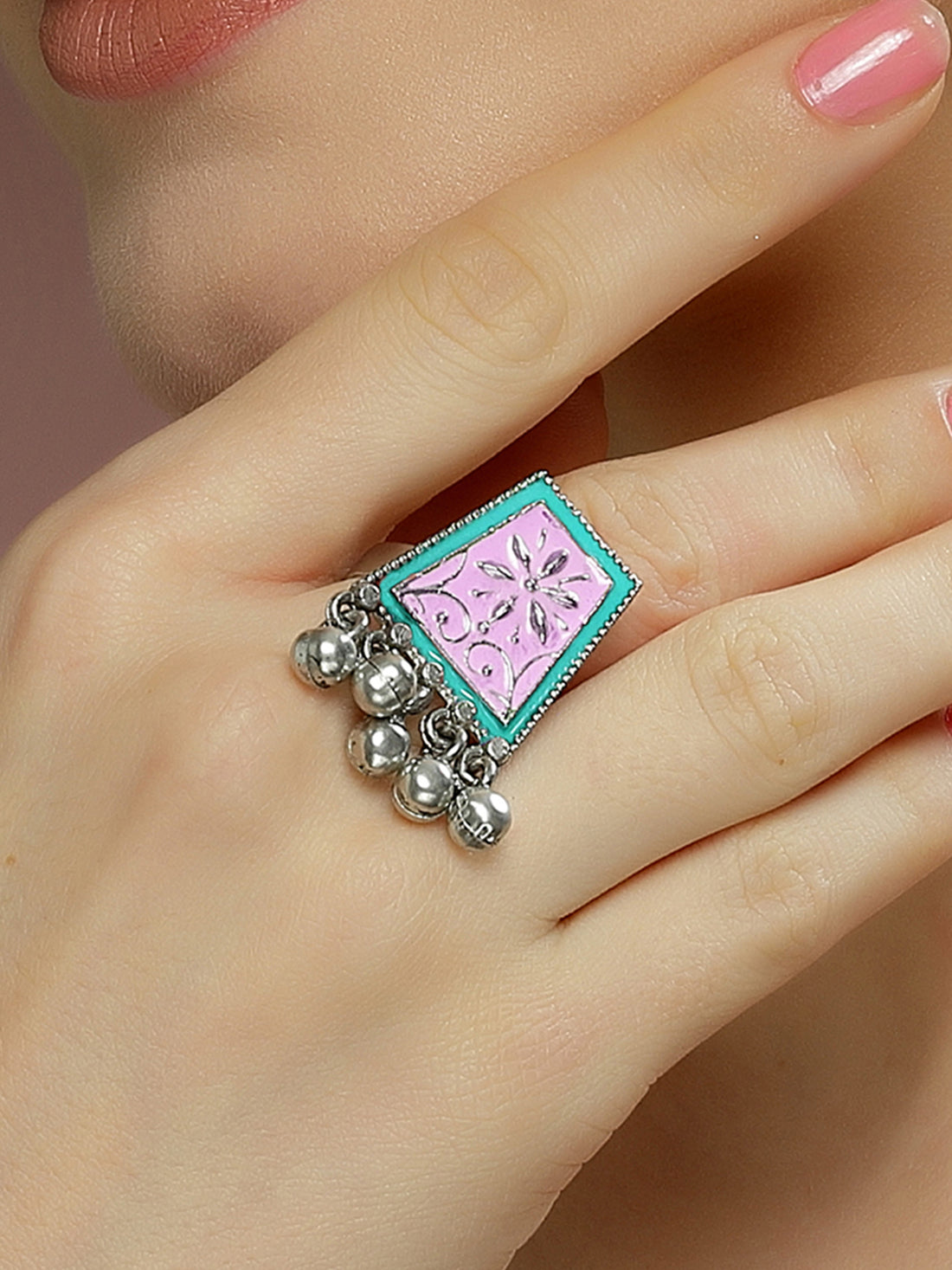 Karatcart Oxidised Silver Pink and Lime Green Meena Finger Ring for Women