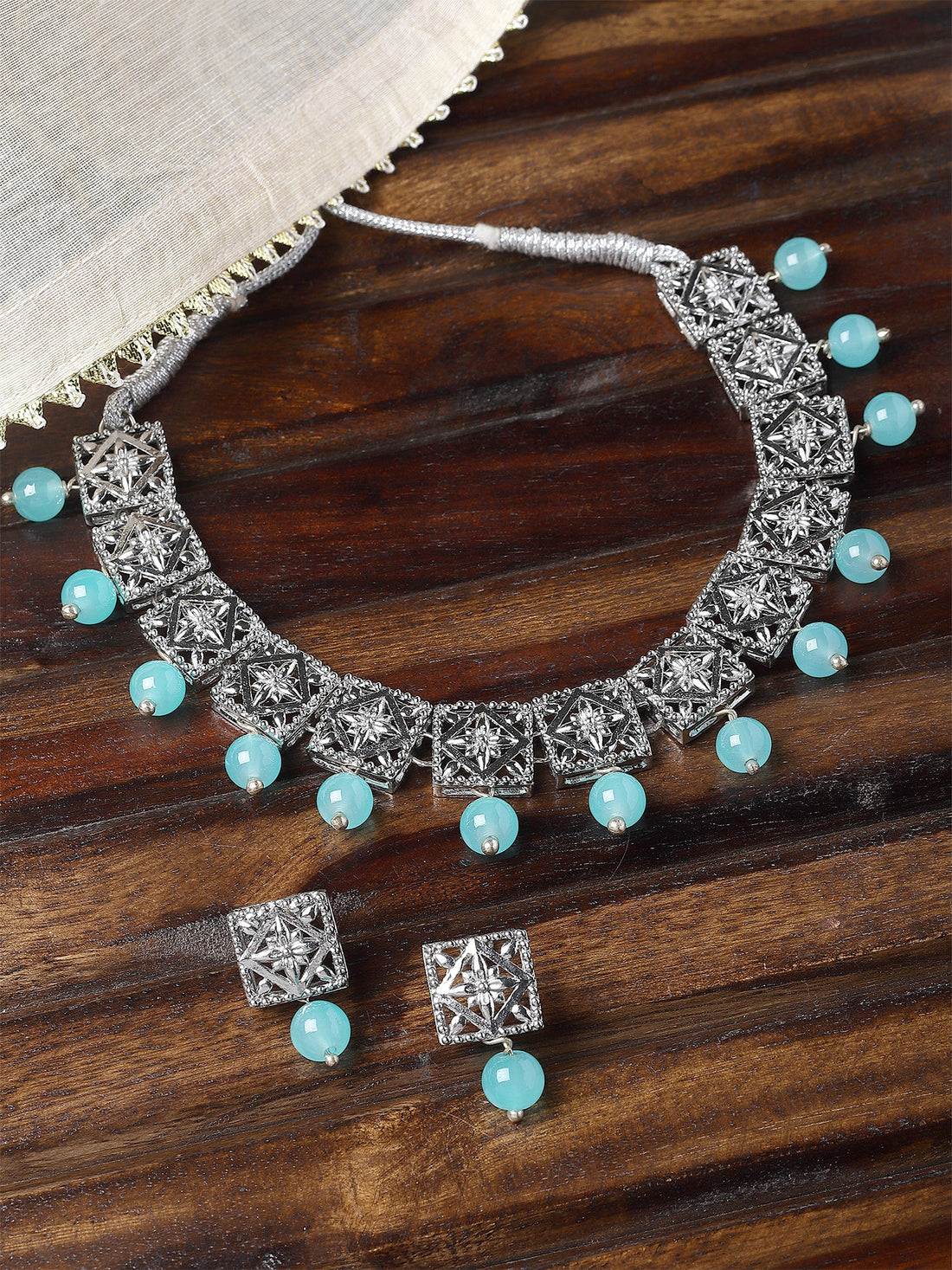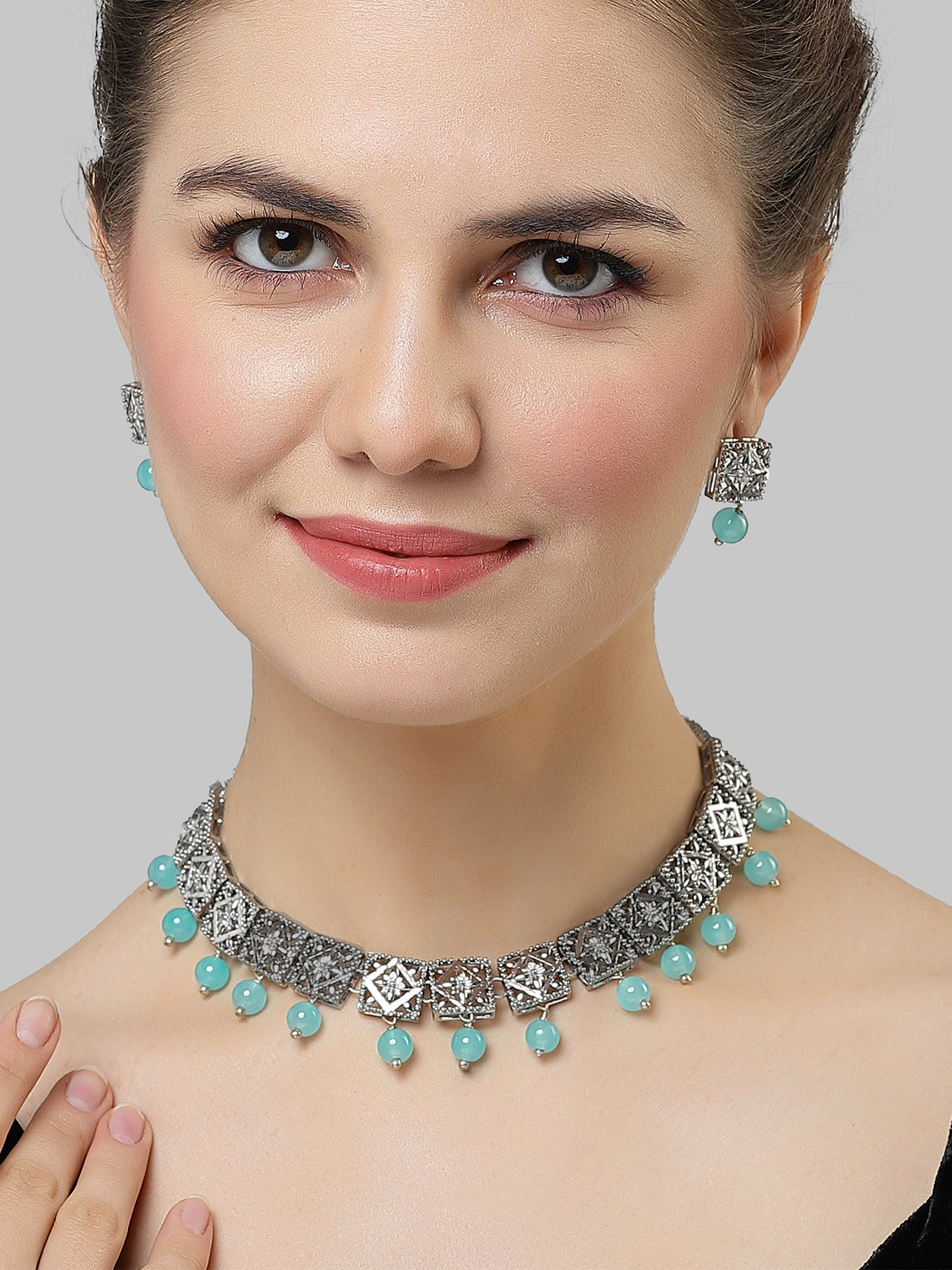 Karatcart Oxidised Silver Plated Light Blue Beads Kundan Necklace Set for Women