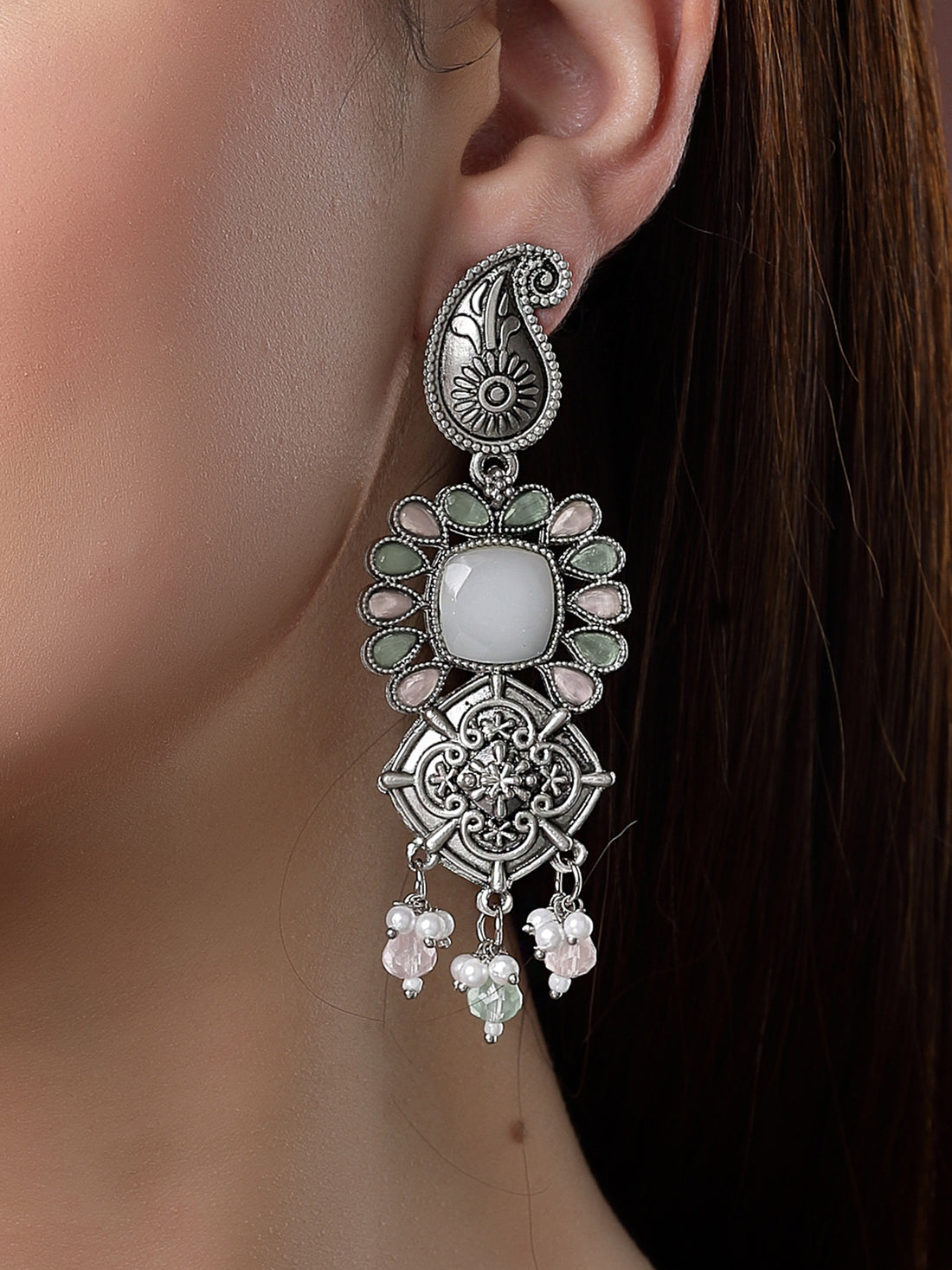 Karatcart Oxidised Silver Pink Stone and Beads Drop Earrings for Women