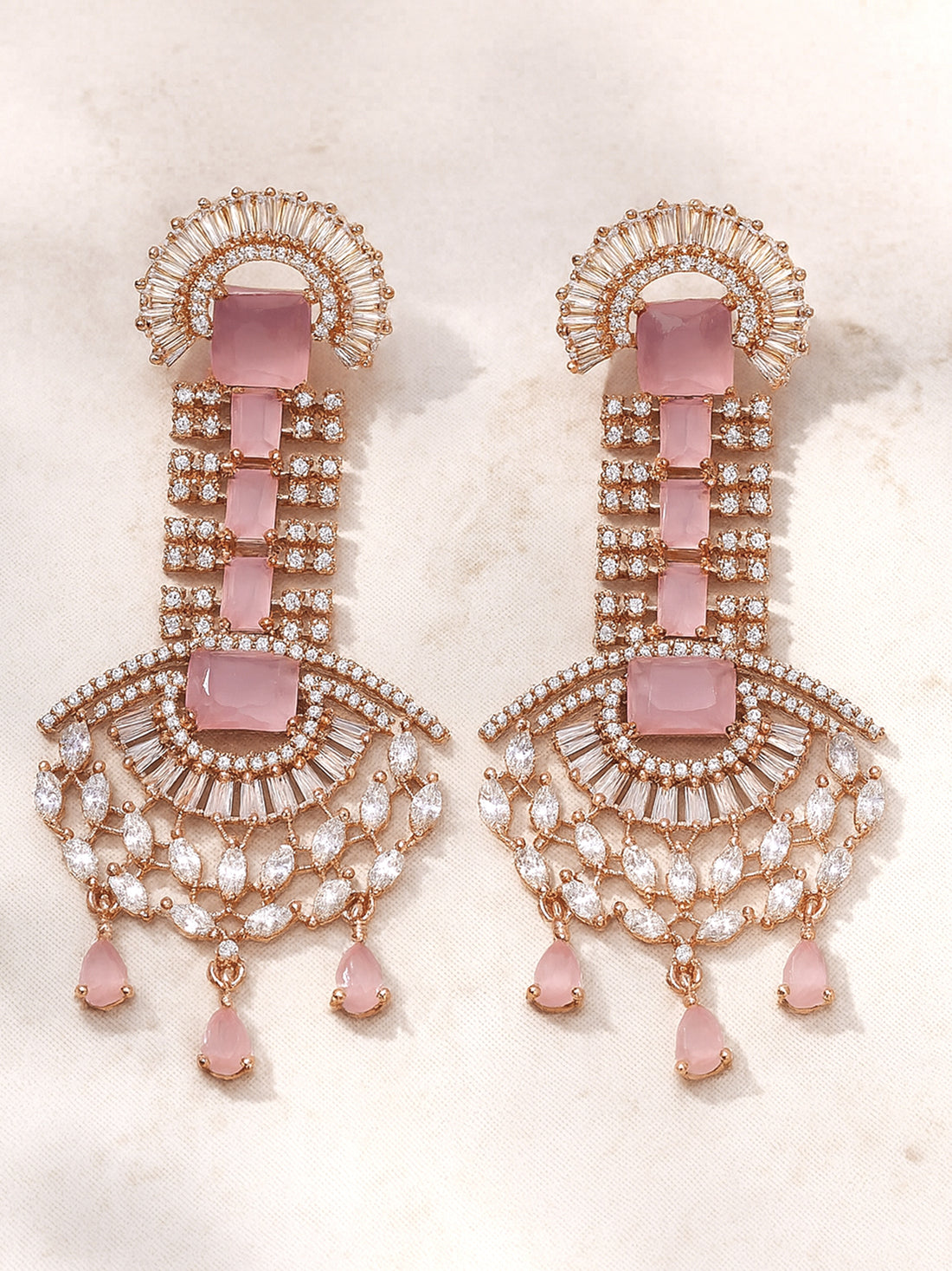Pink & Rose Gold American Diamond Studded Contemporary Drop Earrings