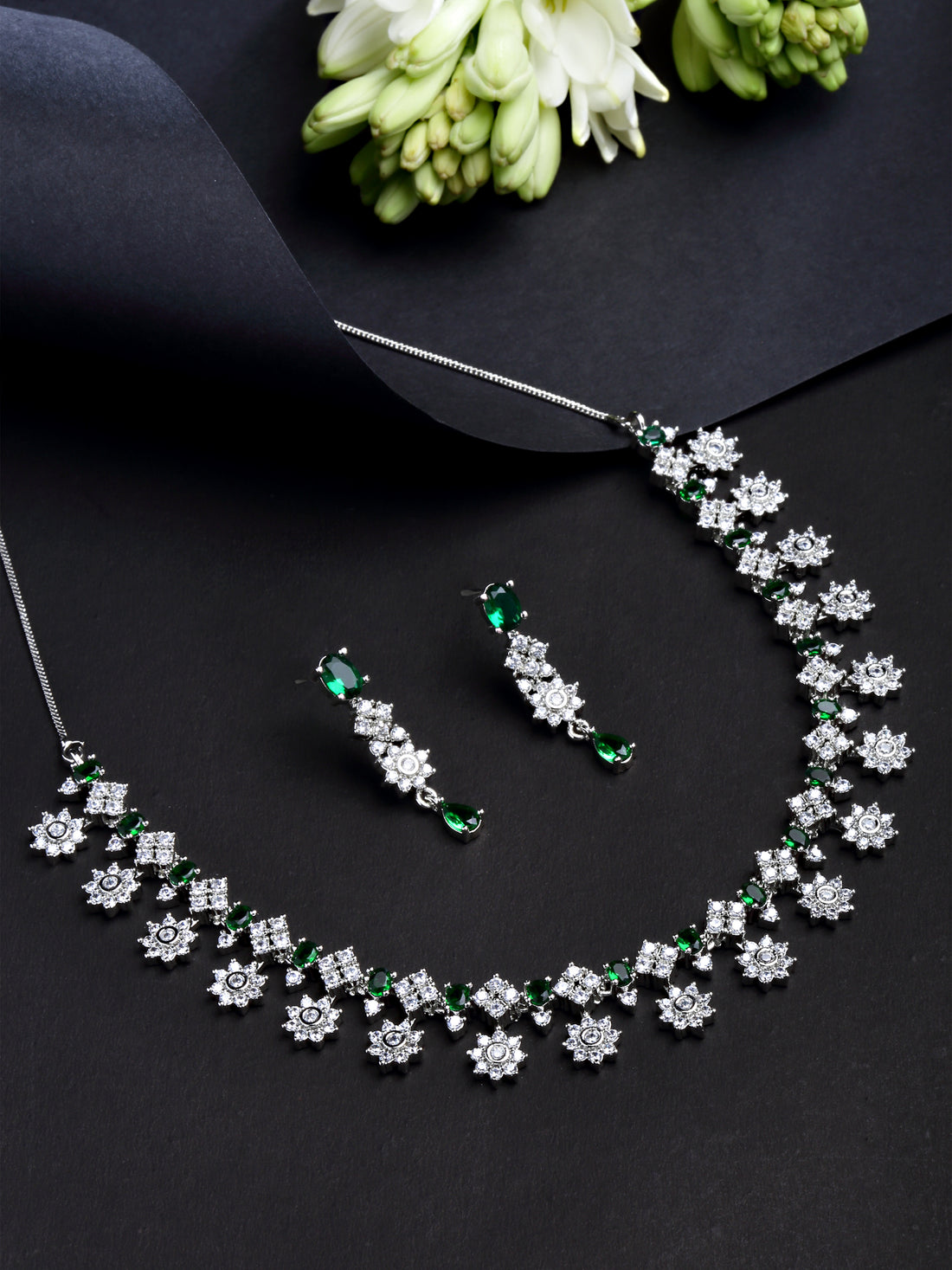 Karatcart Silver Plated Triangle Shape Green Cubic Zirconia Studded Necklace Set for Women