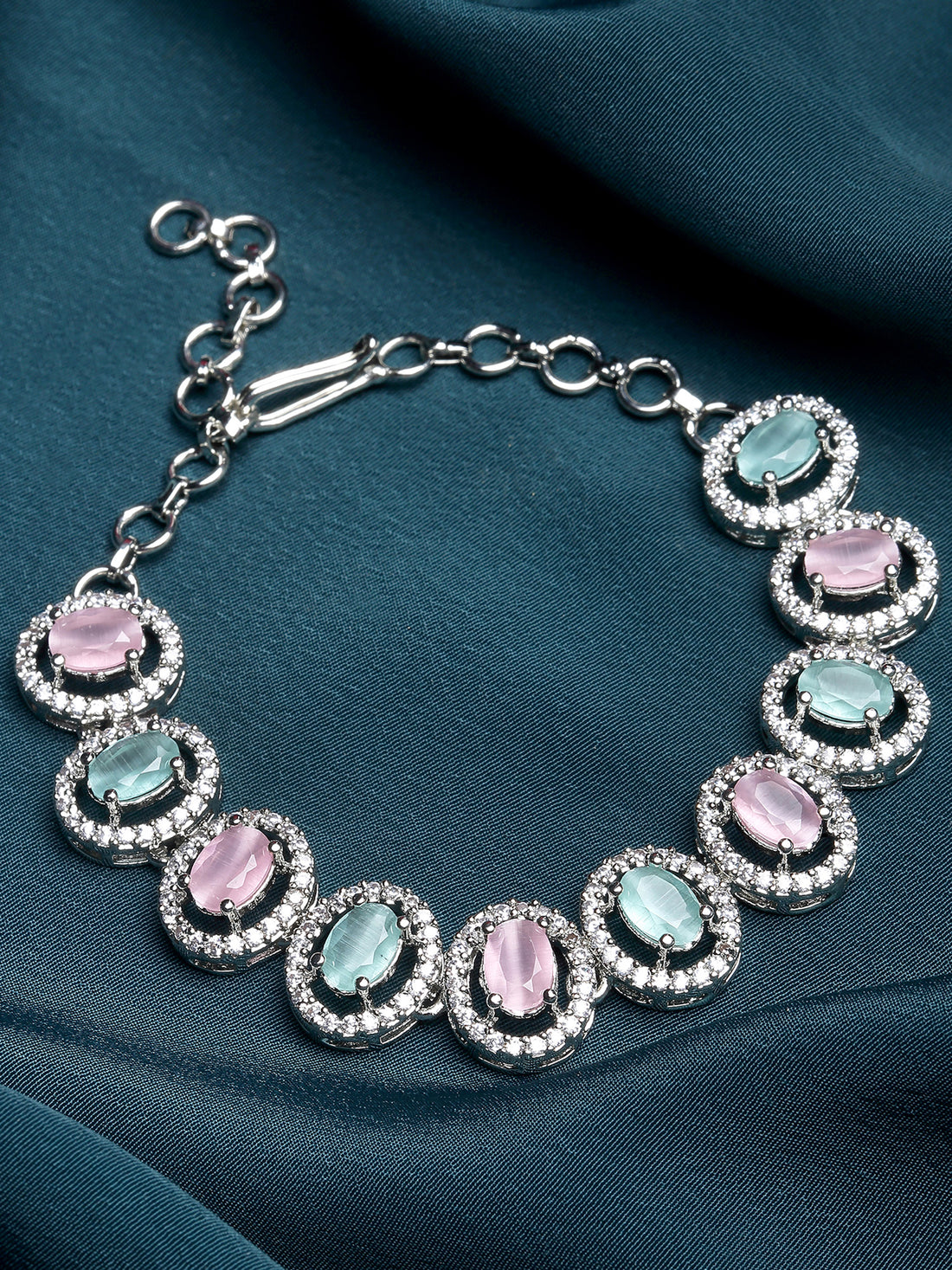 Karatcart Silver Tone Pink and Light Green CZ Studded Bracelet for Women